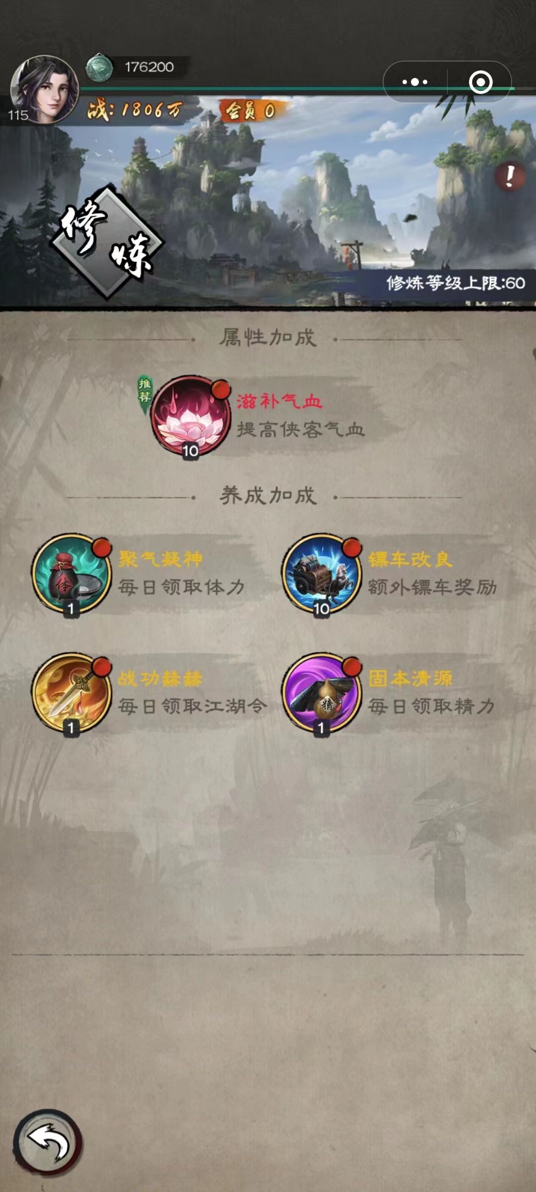 最最重要的是帮会仓库捐献,每周一,周三,打完问鼎江湖。把用不上的草药都捐了,换取大量帮会贡献,现在出来新功能修炼,需要大量帮会贡献去升级。滋补气血,可以加升英雄的血量,个人建议,这个必须放在第一位升级,镖车改良这个功能,如果你觉得拉镖太慢,或者拉镖次数太多的了,点拉镖就对了,升级拉镖不仅可以加速镖车速度,还有机会镖车翻倍。如果兄弟们觉得日常精体不够用,那么升级聚气凝神,固本清源是很好的选择。平常我们的战功令满数是50个,如果你感觉战功令不够的用的话,那么就升级战功赫赫,每天12点--23:59分,都可以去福利界面去领取。兄弟们加油赚帮会贡献,把修炼点上去。
