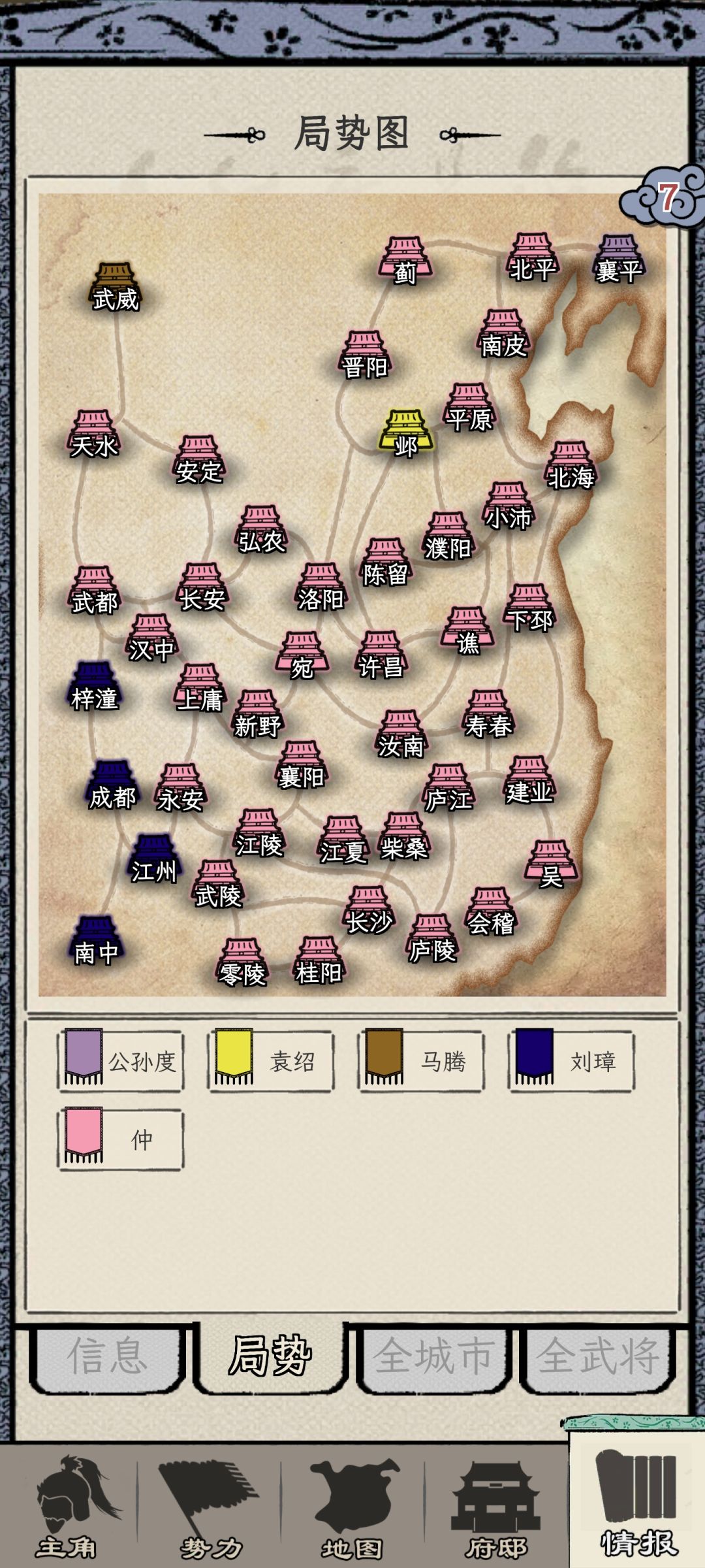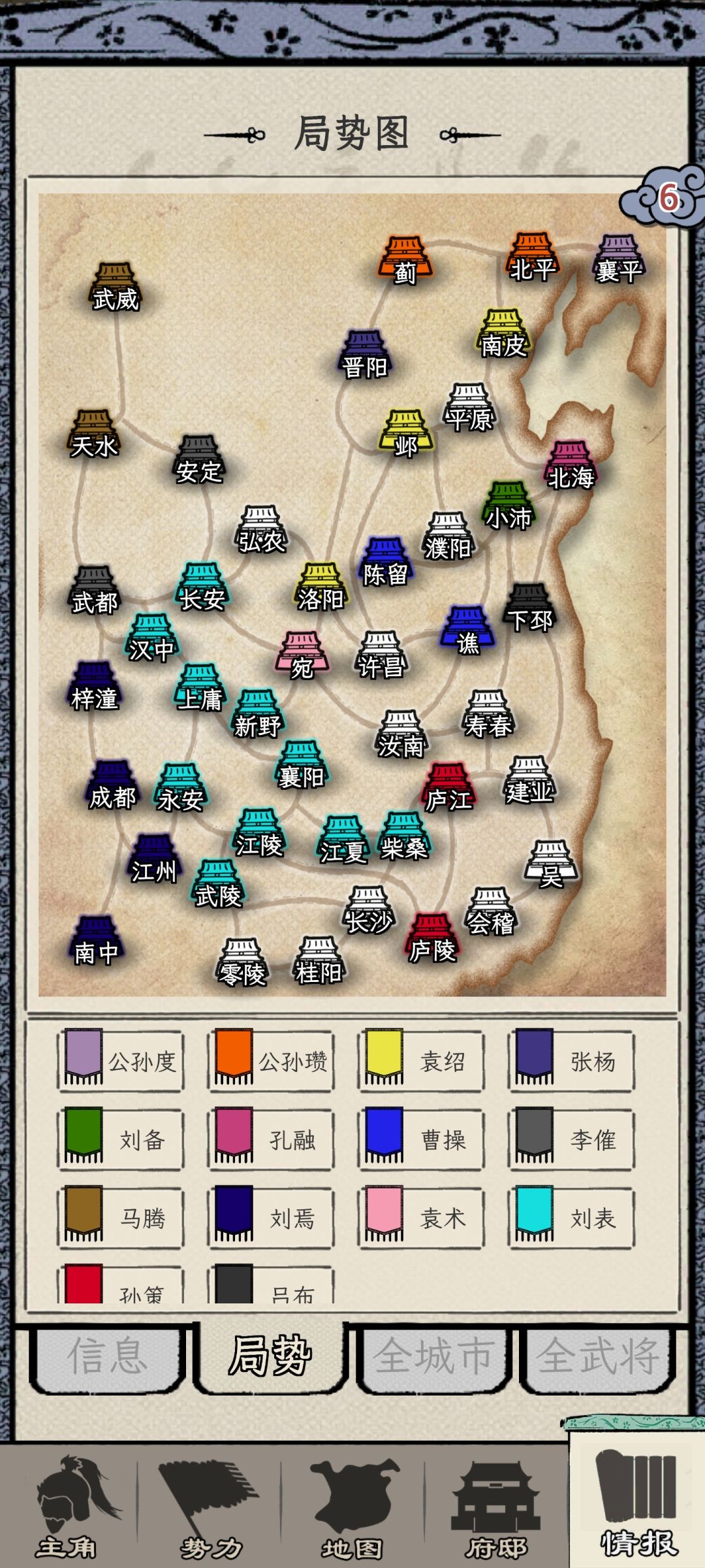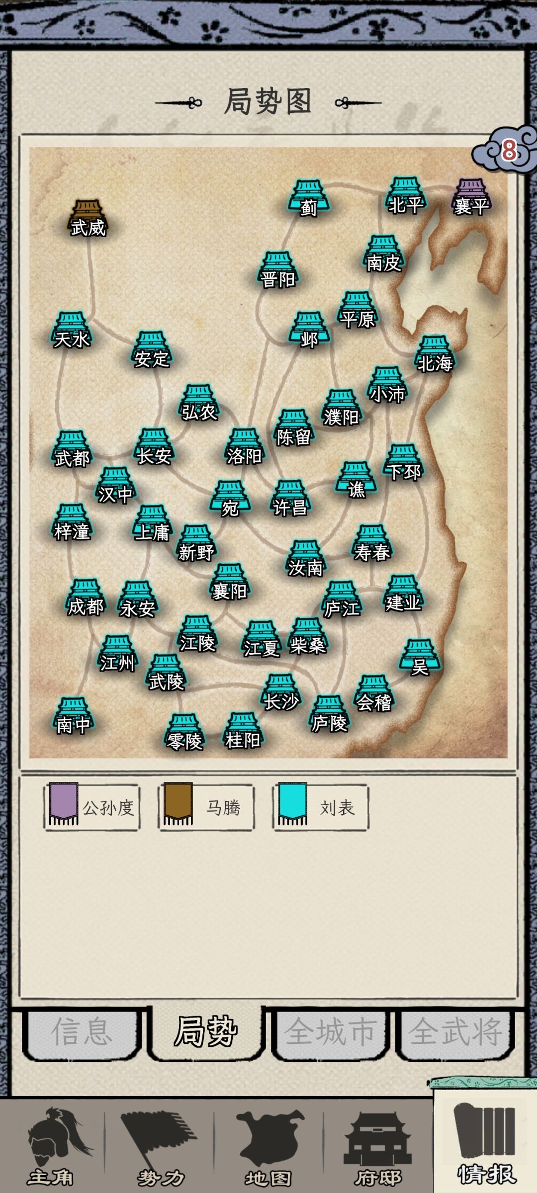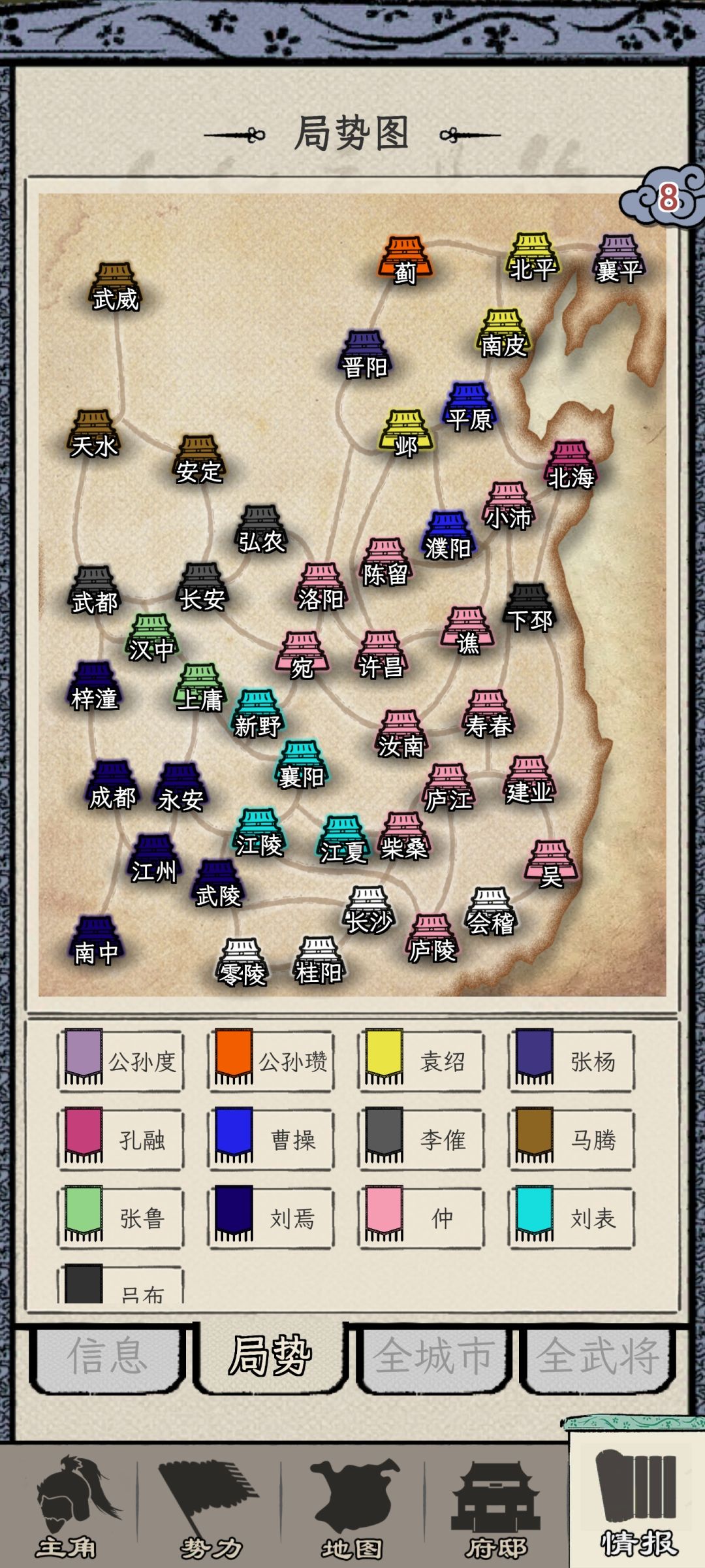一开始接壤的,除了白城,其他的都是多城势力,长安的李傕,陈留的曹操,襄阳的刘表,并不适合做最初的攻略目标。