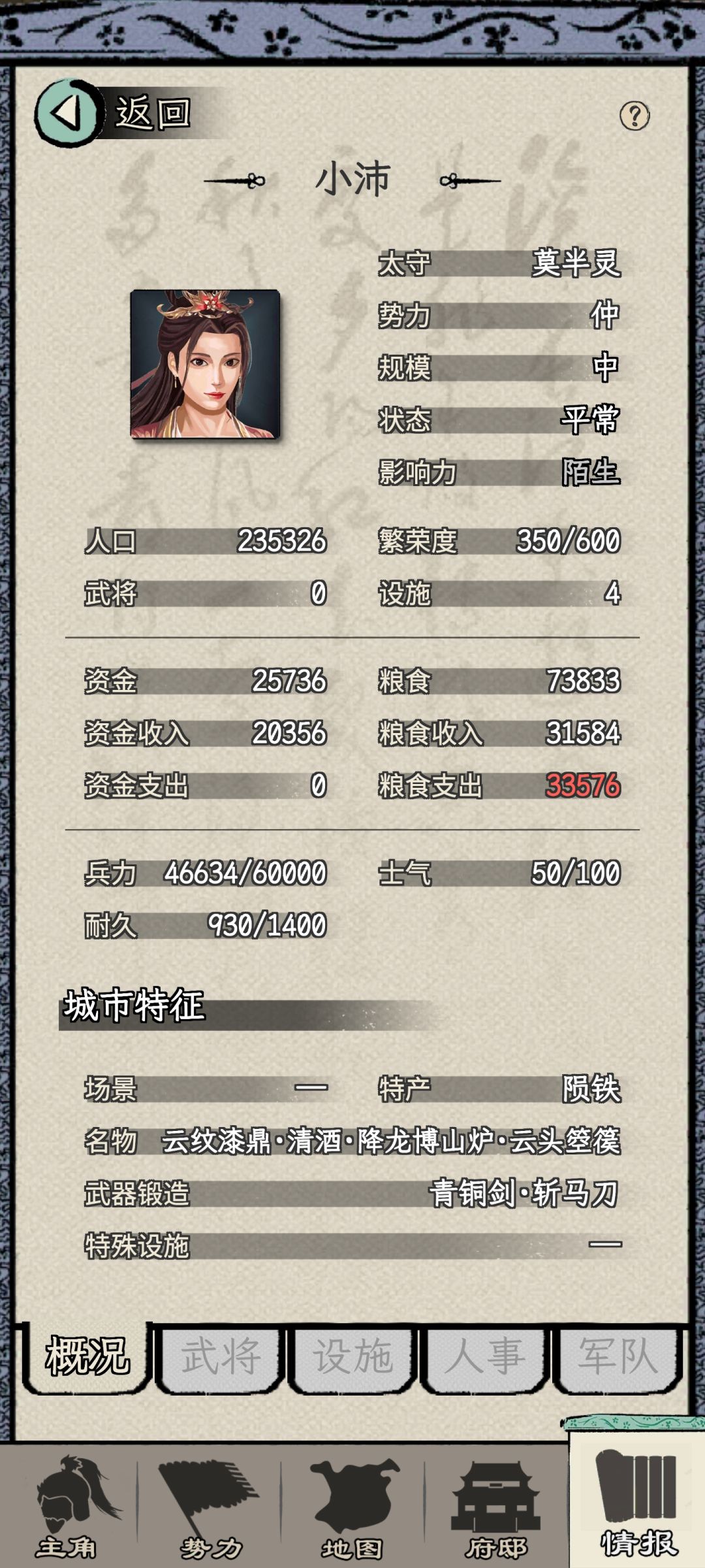此时刚刚四品,剩两个城兵都不多,6w左右,我手操打一个,所有5000、2000部曲的武将集中去打另外一个,妥妥一回合统一了~~