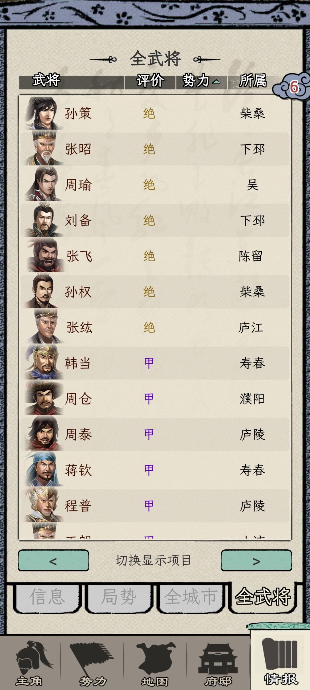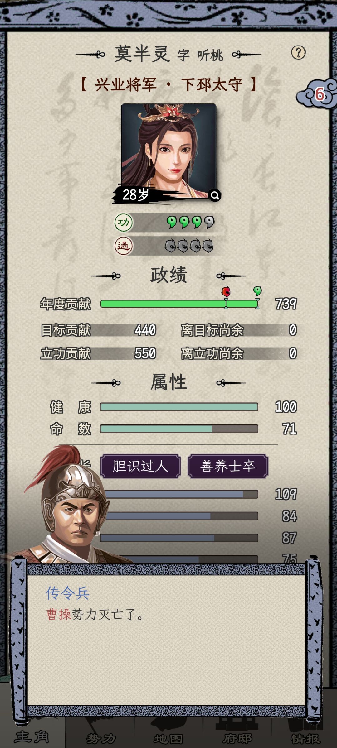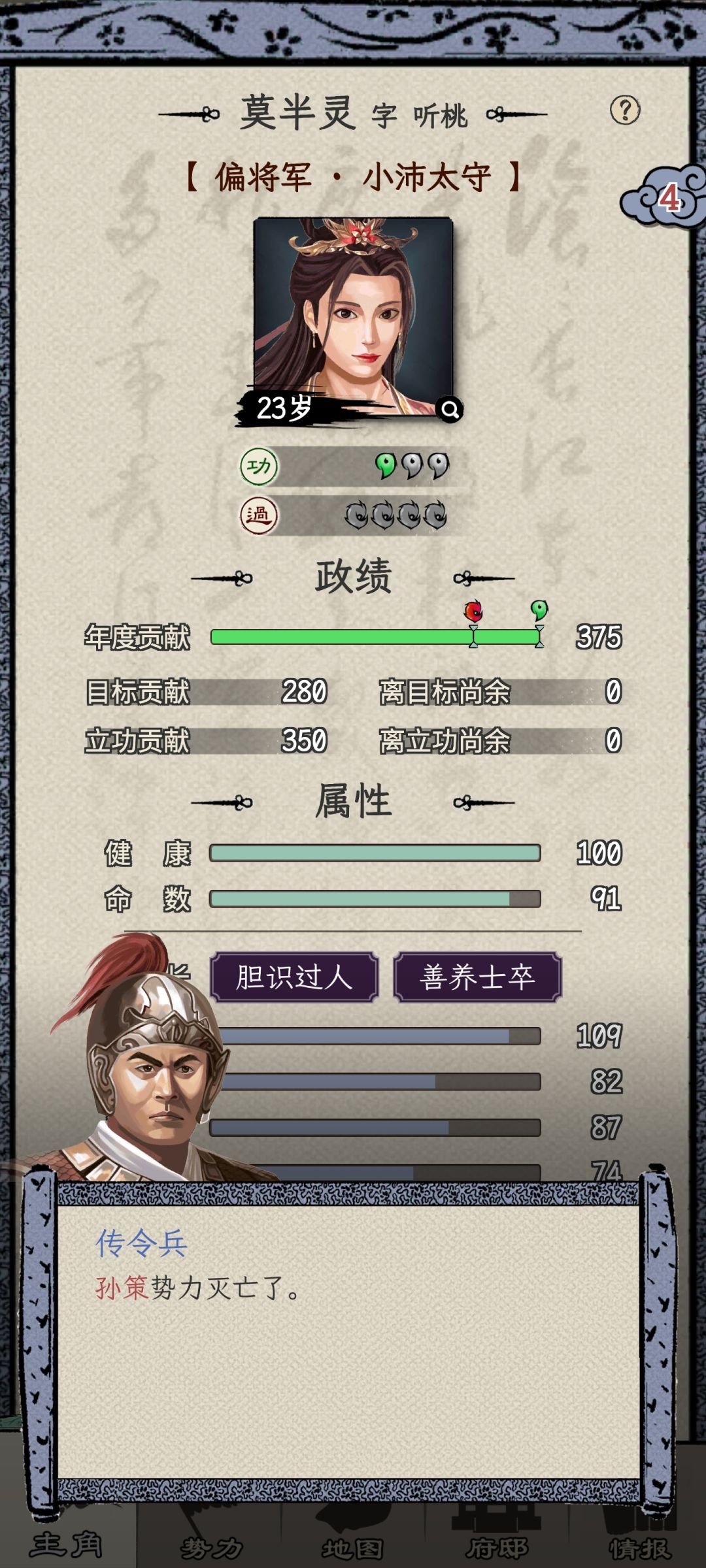 3- 提前灭亡对应势力,可以阻止剧情杀,比如我很早就收了孙策和吕布,他们后续的剧情杀就没有触发,一直活着当我的小弟(比较奇怪的是司马懿都收了,诸葛亮还没出来,全武将列表里就没他,可能是卡什么bug了)