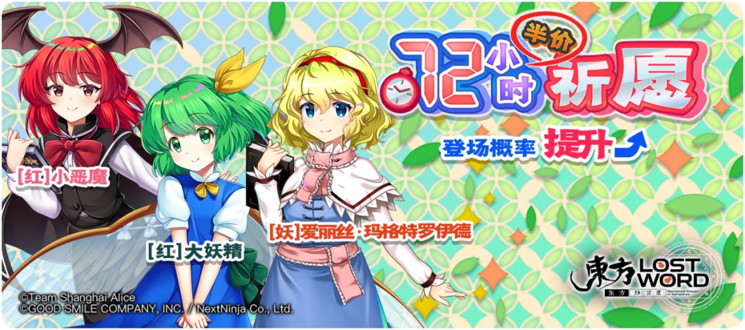 祈愿概率UP角色:[红]小恶魔、[红]大妖精、[妖]爱丽丝·玛格特罗伊德