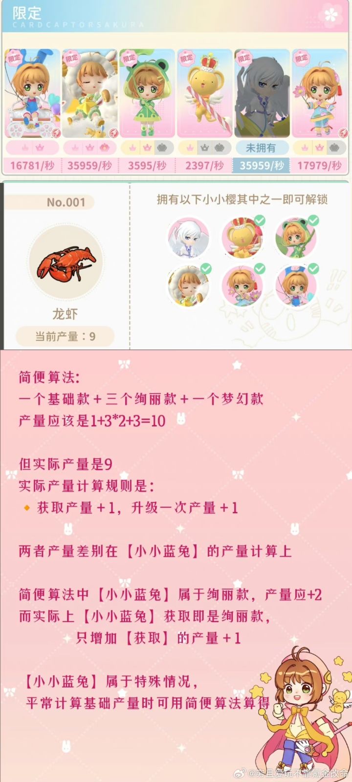 【特殊情况】按照基础款,绚丽款,梦幻款计算为简便算法,但对于【小小蓝兔】这样【获取即是绚丽款】的不适用,【小小蓝兔】只能提供【获取】的产量+1,因并未升级,所以无法提供【绚丽款】的+2。(p2)
