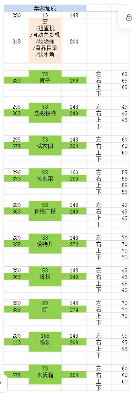 由于空地有限,我只对比了上排。设施应该都是对上下左右货架都有加成的,我试了几个设施都是如此(通过上下变换位置)后面就懒得实操了。