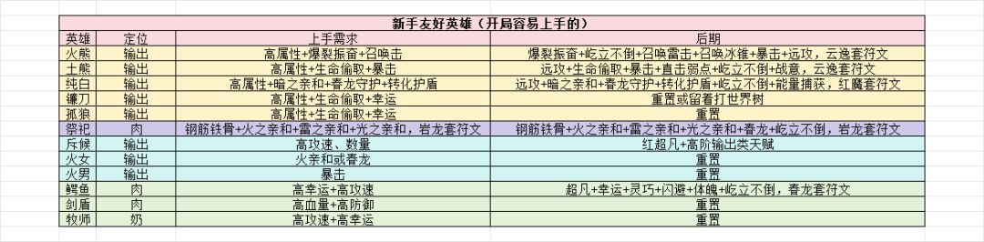 入选英雄并不是说后期就强,主要是对新玩家而言入手资源投入少,甚至可以通过刷初始直接获得。新版本新手前期坎很少了。第一个大坎在黑曜石火熊。过了这个坎,其实已经初步进入养成中期,大家想养什么也会有自己的目标了。