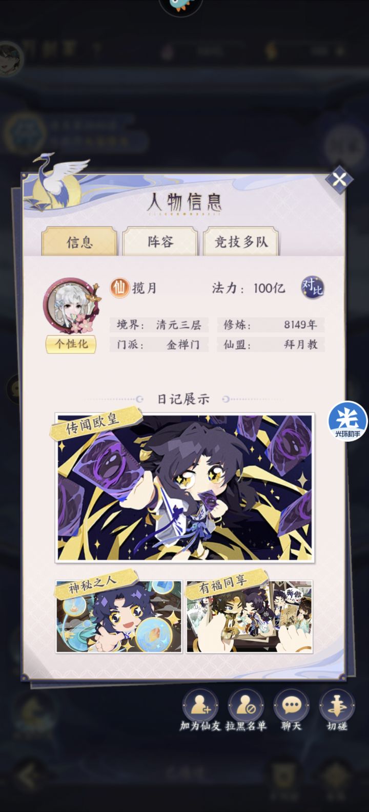 揽月:100亿 阵容:王舞(六星) 玄武(一星) 千鹤(一星) 白泽(十星)
