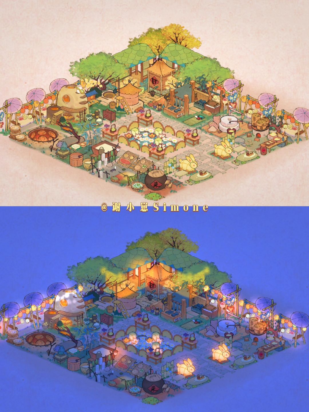 晚上也很好看的集市庙会风,需要注意的是2个商行没有「鸡羊蚕饲料」4个生产建筑,后续我会补发喂养一条龙的布局。