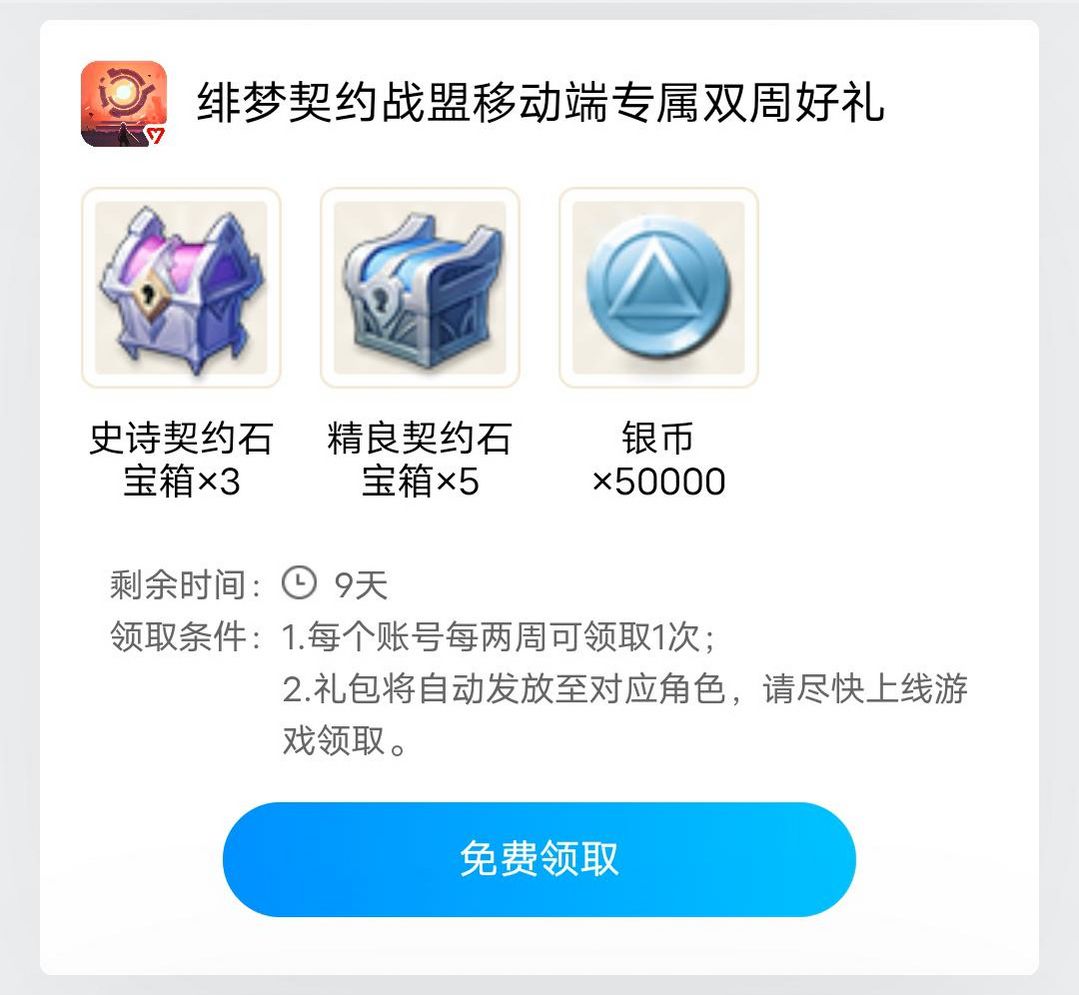 安卓:登录战盟APP——选择右下角“我”——点击“我的应用”中的“礼包”按钮——选择【绯梦契约战盟专属双周好礼】——点击“免费领取”——选择账号下任意一角色即可领取,奖励将以邮件形式发送至冒险者邮箱内。
