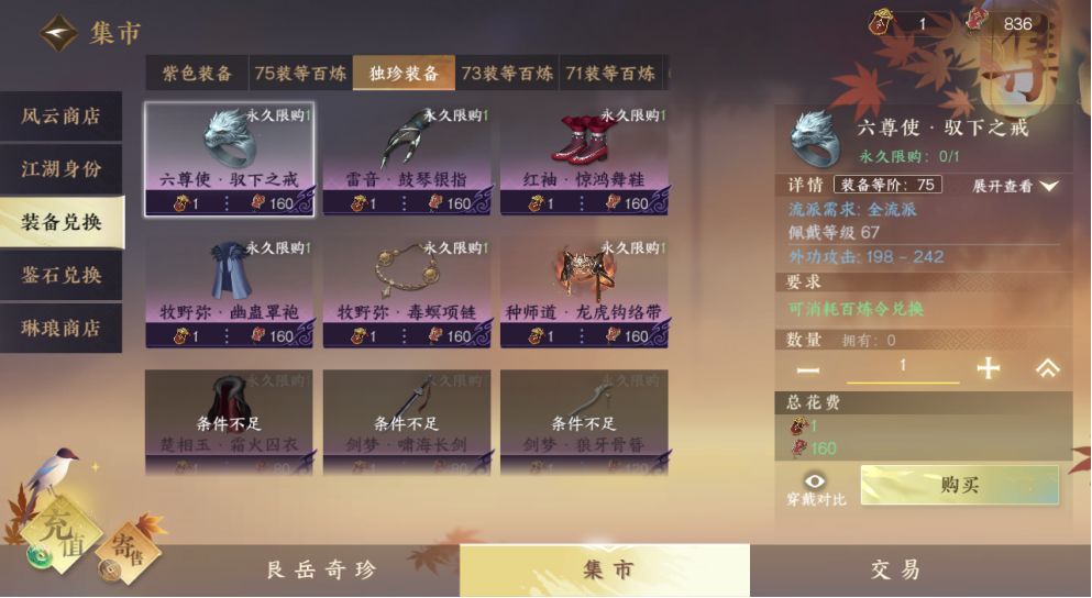 1.独珍兑换!位置:集市-装备兑换-独珍装备!条件:需要击败对应BOSS两次,签字也算,每件装备限制兑换一次!