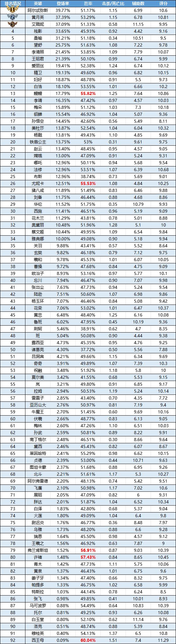 本周,登场率、胜率和评分榜单英雄均未有较大变化,但是ban榜更新迭代很快~弗兰肯斯坦没有续住,新伙伴依旧为坦克:许褚
