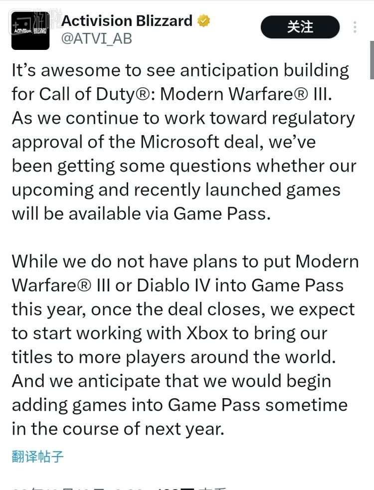 3. 虽然收购案还未最终落定,但动视暴雪已发布声明表示,《使命召唤 现代战争III 2023》《暗黑破坏神4》今年不会加入Xbox Game Pass,旗下游戏将于明年开始添加至Game Pass。