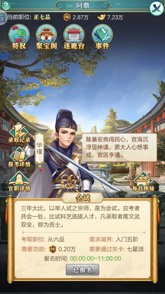 分为皇榜、会试、殿试、天试四个阶段,可进行官品考核,提升官品