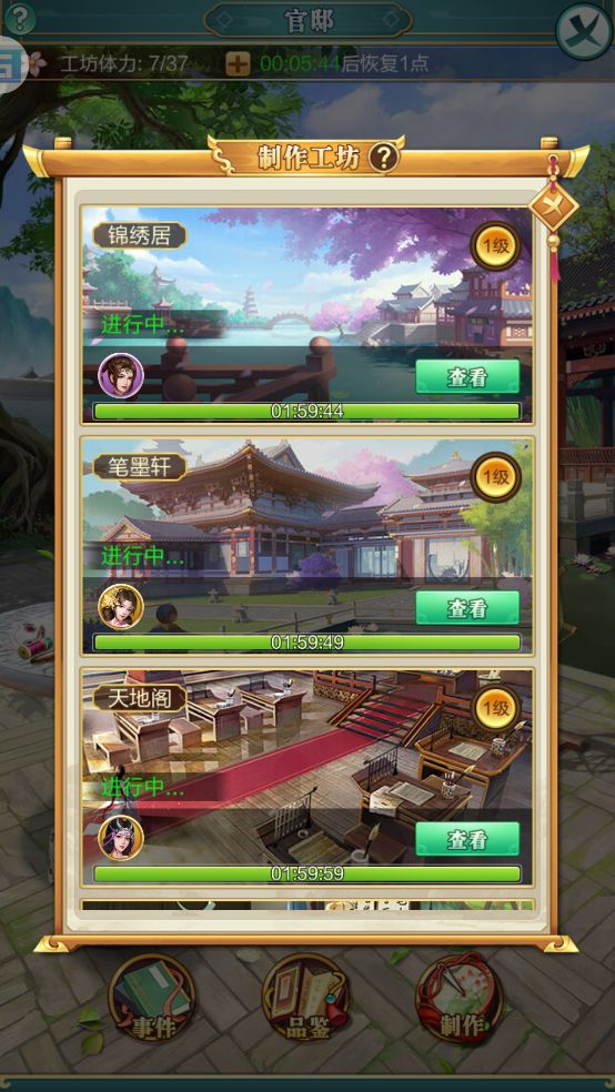 官邸在正六品开启,可安排红颜在官邸中制作品鉴道具,官邸有四个红颜作坊,上阵红颜即可开始工作。
