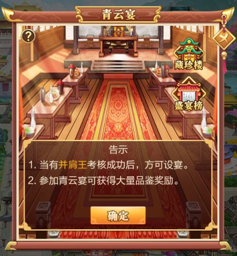 极品官职获得者自动成为宴会主人,可调整宴会规模,越高级的宴会奖励越丰富,宴会主人获得双倍菜品奖励。