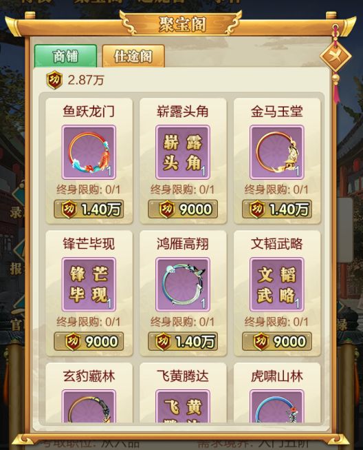 正九品开启,聚宝阁分为仕途阁与商铺,消耗功勋进行购买。
