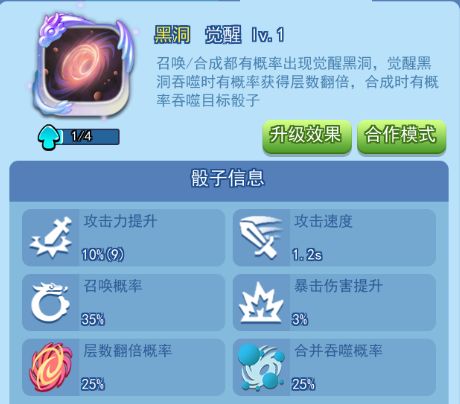 首先我们可以先看一下黑洞的面板,其实黑洞的初始面板是很低的,九级的黑洞的初始攻击力也只有9点,每层也只能提升7点伤害系数,这也就是大部分玩家都诟病的一点,前期的输出实在是太低,黑洞的初始输出甚至不如许多辅助骰子,而且在黑洞前期基本上是不能吃骰子的,只能在蒲公英放置足够的情况下才能开始吃骰子,这就导致很容易清不动小怪导致暴毙。