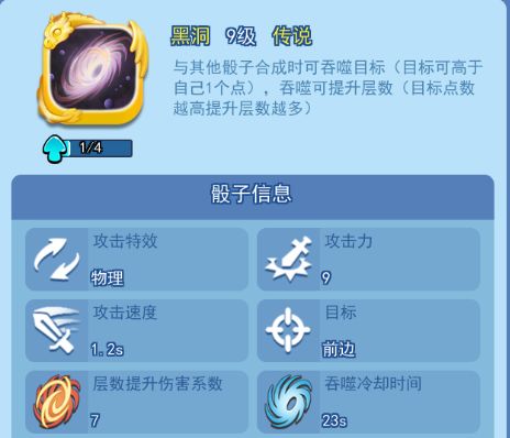 欢乐对决黑洞是游戏中特别强势的吞噬骰子,她的技能是不断的吞噬其他骰子来提升自己的层数,层数越高伤害也就越高,所以玩家如果想要黑洞骰子打出很高的输出的话,就需要不断的提升他的层数,许多玩家都在说黑洞没有输出,根本打不动小怪,那么黑洞是为何没有输出呢,下面就来位大家解答。