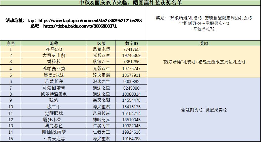 最终,我们抽选出了5位游骑兵们,每人获得“热浪晴滩”礼装*1+猎魂觉醒限定周边礼盒*1,抽选出了10位游骑兵们,每人获得全能刻刃*2+觉醒果实*2,并为所有参与玩家提供幸运草*2的奖励。
