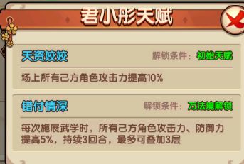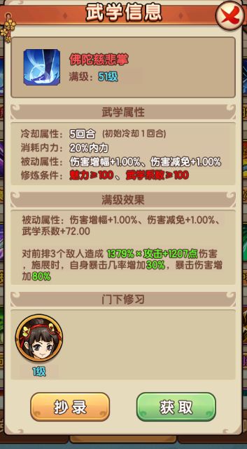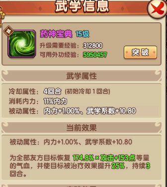 还有很多合适当挂件的弟子我就不一一举例了,大家可以点开游戏中的图鉴-弟子栏查看,还要注意一般治疗类技能都是首回合冷却的,所以有人给治疗类弟子带的全是加血型外功,结果发现第一回合都是平砍的就是这个原因。