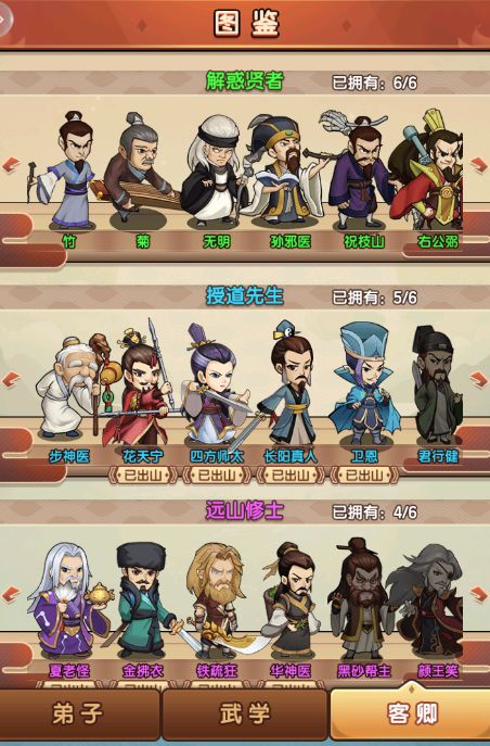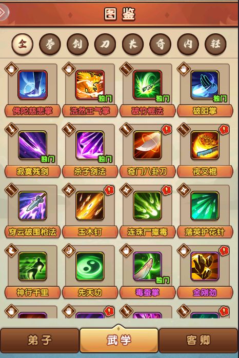 我们再来说下武学分类:弟子的武学分类可以分为天赋+3外功+1内功+1轻功,初始是开放2个外功格子,等弟子赏赐等级达到内门时开放第三格;除了天赋是固定的其他的都可以通过学习活动(除独门武学外)。这种游戏设定就给了我们很多中武学搭配的可能,也是我们能以弱胜强的一个点,搭配的合理性、与其他侠客配合程度以及武学上阵顺序都能影响战局。具体武学描述可以从图鉴武学中观看,有一点要注意除了独门武学不可以抄录(顾名思义把你已经学的武学再抄一本给其他侠客学习)还要注意一些武学的限值条件,比如(聪慧≥100,定力≥80等)条件达不到及时有武学也不能学,这需要我们吃丹药来增加一些弟子的相关属性。