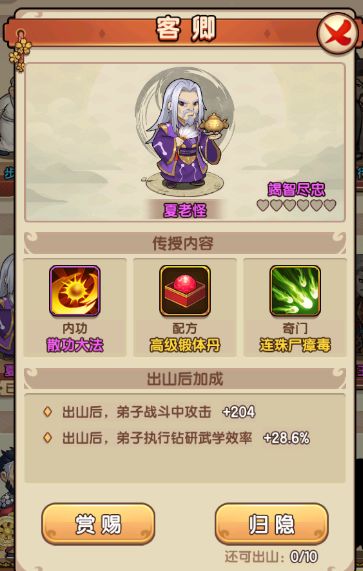 3、客卿系统:达到一定条件或者集齐碎片可以招募客卿来门派,客卿可以带来一些武学或者一些配方供我们学习,有些是需要解锁条件的(赏赐增加好感)。客卿出山是可以增加所有弟子的一些属性或者工作效率。