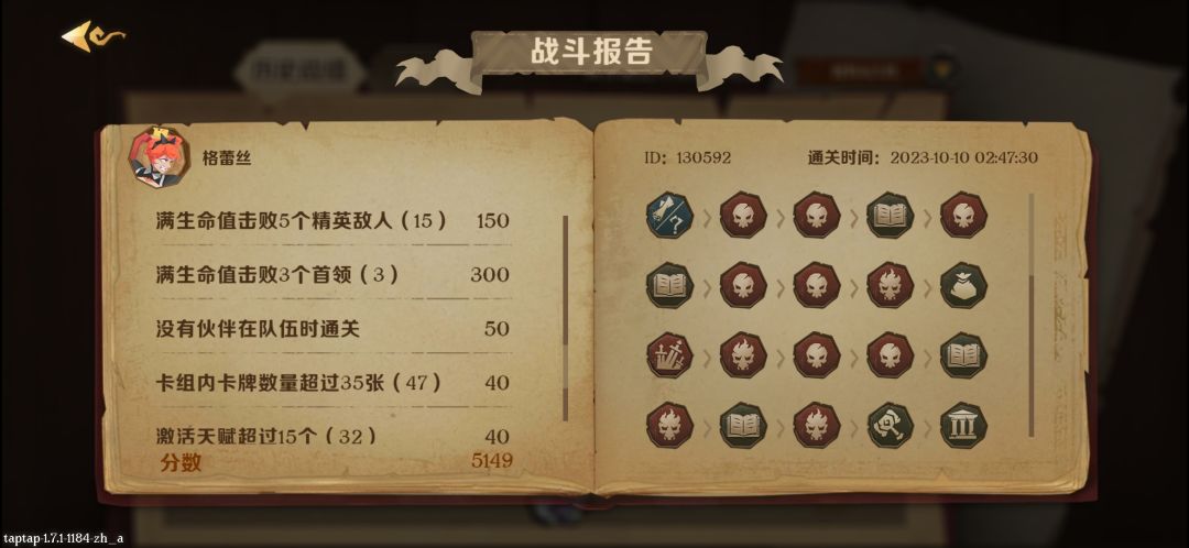 ②我用格蕾丝打分主要就是不开迷雾,刷一个一层试炼或者不甘,试炼的话传送之戒(刷精英本拿天赋神器),不甘的话助推器(灵活更改地图坐标属性),其他的神器就不是很推荐了(对强度增强作用不大,应急用的东西了),传送之戒拿到基本就是滚雪球,只要前期抓牌和事件不要太崩,6回合就刷一个精英,很容易把天赋叠到30+甚至叠满35个,所以是最好用的神器了,打分也是,是真的神器。助推器太看脸,而且和传送戒指的本质区别就是,传送之戒可以理解为是6回合多一个地图格子(随意选择,个人推荐精英怪性价比最高,其次是铁匠和商店,看你的需求抉择,但是boss就不能重复刷了),助推器就是3回合或者5回合改一个格子属性,本质上并没有多一个地图格子,所以强度就低了。![[嗒啦啦4_破防]](https://img.tapimg.com/market/images/e7a8b374540ede92a57ce1f447a9ec65.gif)