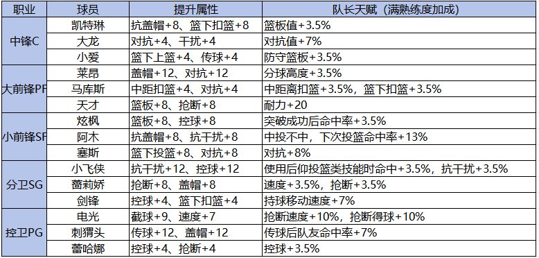 职业殿堂队长位置上的球员将会额外提供一个被动效果加成,职业殿堂里满熟练度的球员越多,队长的被动效果就越强!例如在队长位置放置“莱昂”,该球员天赋技能为“无限高度”,所有的PF将获得“分球高度+1%”的属性加成。以此类推其他职业殿堂队长位置放置其他职业球员可获得对应的属性加成。