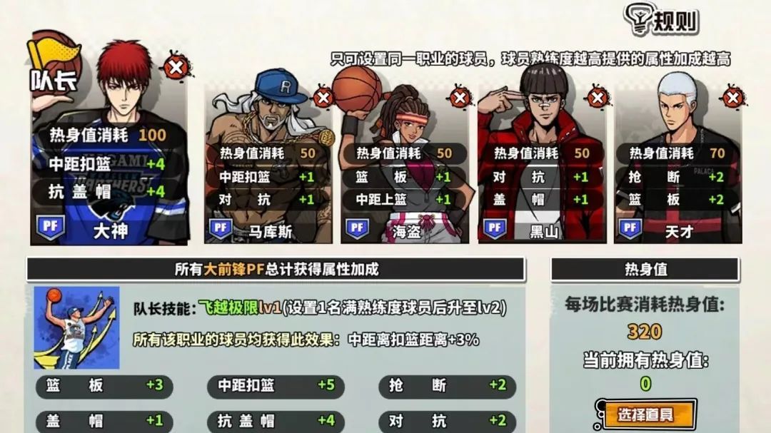 每个职业对应的职业殿堂可以放置五个球员,分为队长位置和球员位置,每放置一个球员,这个职业所有球员在比赛中都可以获得一定的属性加成。例如在球员位置放置“马库斯”,所有的PF将获得总计属性加成“中距扣篮+1、对抗+1”,以此类推放入其他同职业球员可增加不同的属性加成。