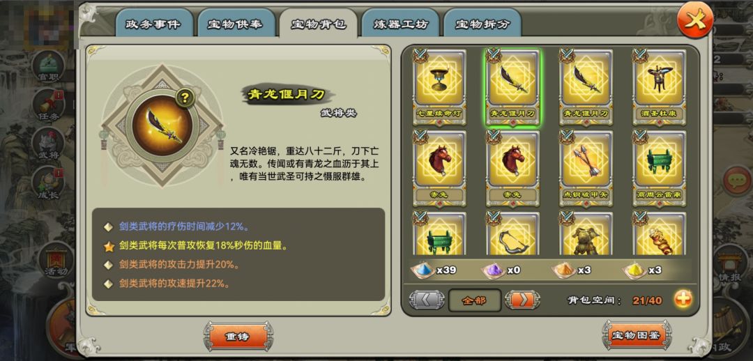 武将宝物推荐:青龙偃月刀2个、七星续命灯1个、乌戈古藤甲1个、天子宝雕弓1个。