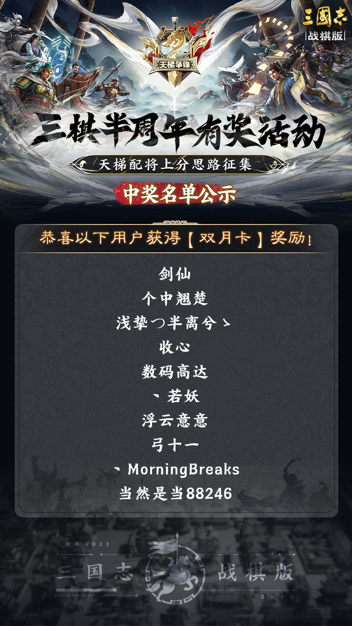 【中奖公示】三棋半周年庆天梯配将有奖活动·双月卡获奖名单出炉!