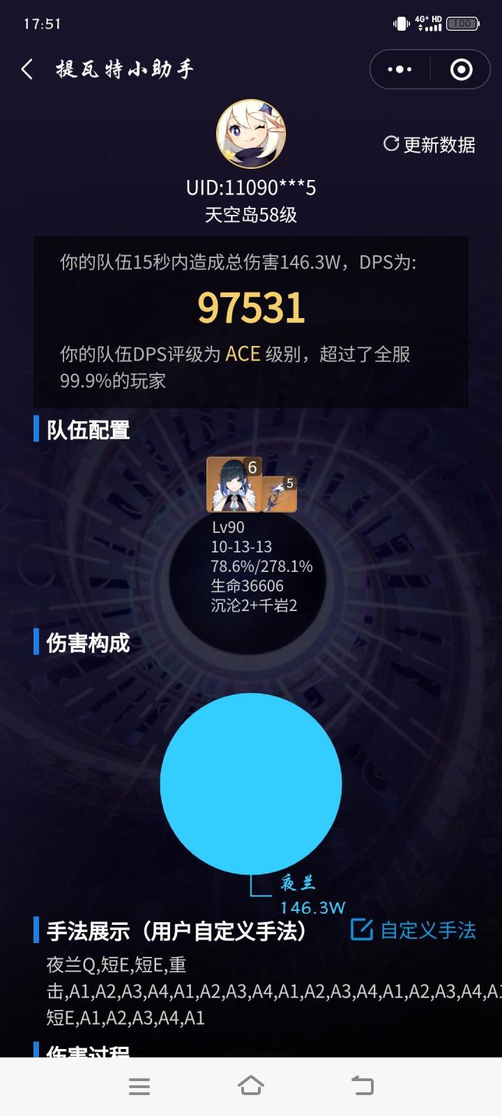首先我用小程序测了一下我的夜兰的伤害,因为夜兰的Q是15秒持续时间,而Q的CD却有18秒,也就是说,夜兰注定有三秒是疲软的。