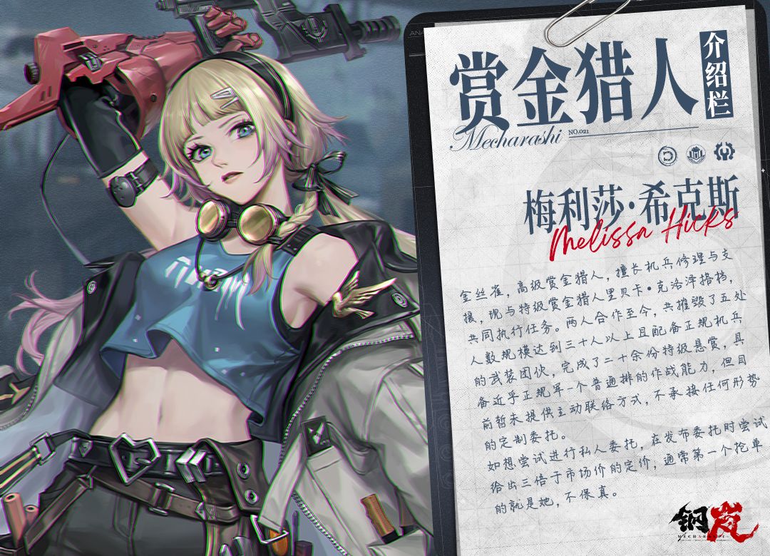 最新一期的赏金猎人介绍栏新鲜出炉,本期封面人物是一位拥有钢铁手臂的可爱少女。尽管看上去略显稚嫩,但在赏金猎人圈内已经小有名气。她就是代号「金丝雀」的梅利莎·希克斯,接下来,就跟随记者的笔触,一窥她的成长经历吧。