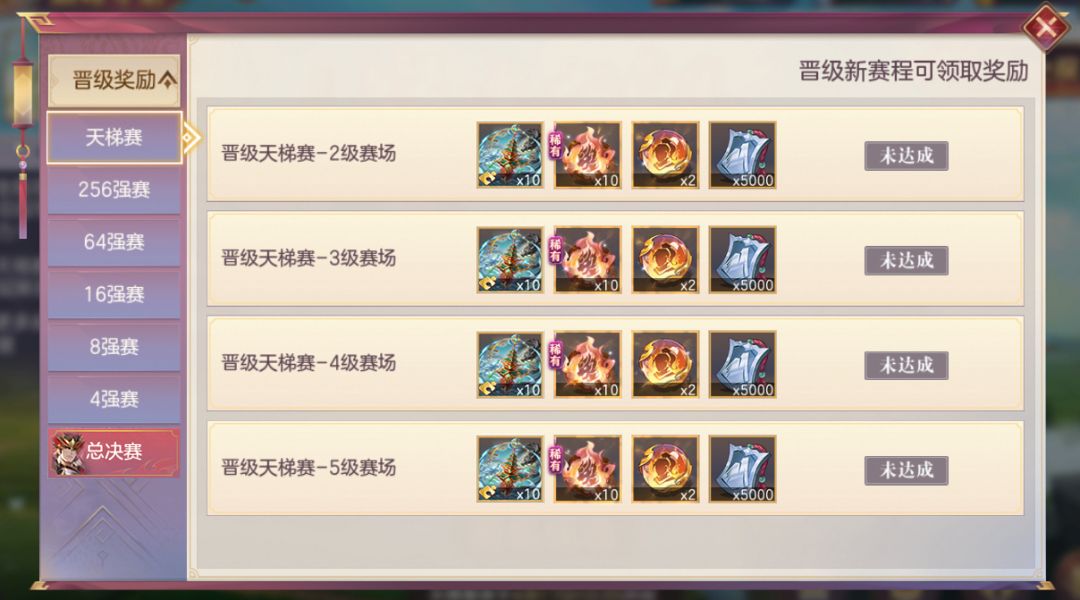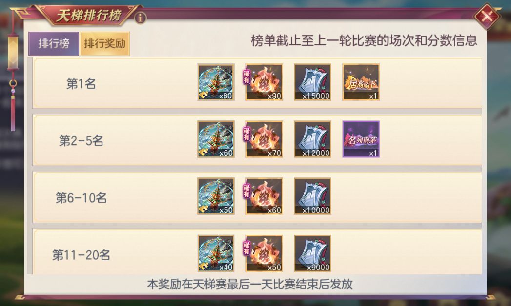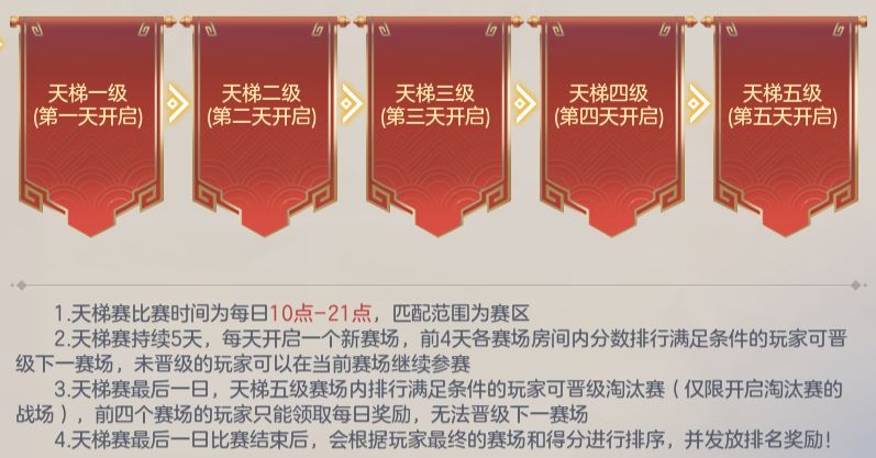 1.巅峰夺魁天梯赛的匹配范围为“山河遗迹”玩法的赛区,初始大家都会被平均分配到天梯一级赛场,根据每日排名决定是否可以晋级下一级,但是没有晋级玩家也可以继续参加比赛,直到第五日,会从天梯五级中选拔出排名靠前的玩家进入到后续淘汰赛阶段。