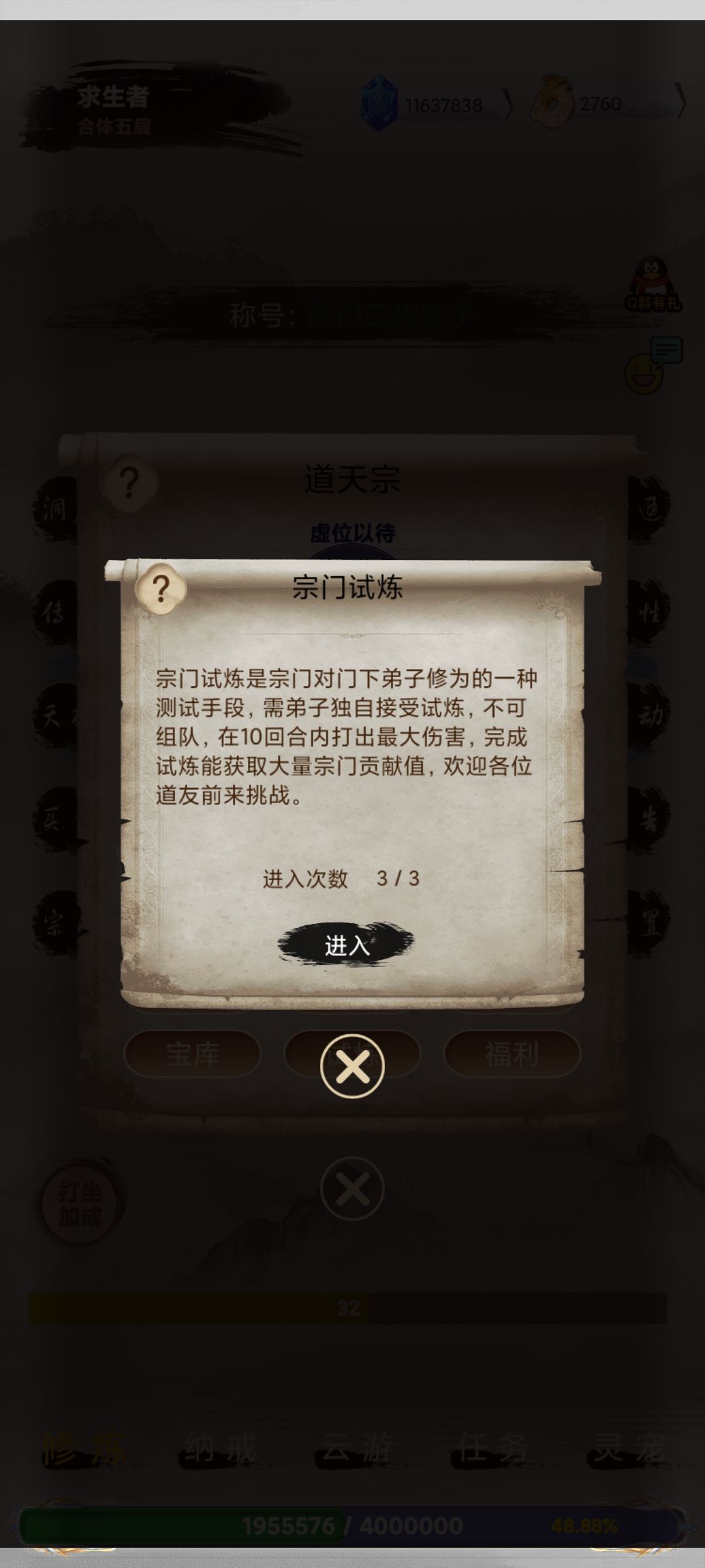 ②宗门试炼是宗门对门下弟子修为的一种测试手段,需弟子独自接受试炼,不能组队,在10回合内打出最大伤害,完成试炼能获取大量宗门贡献值