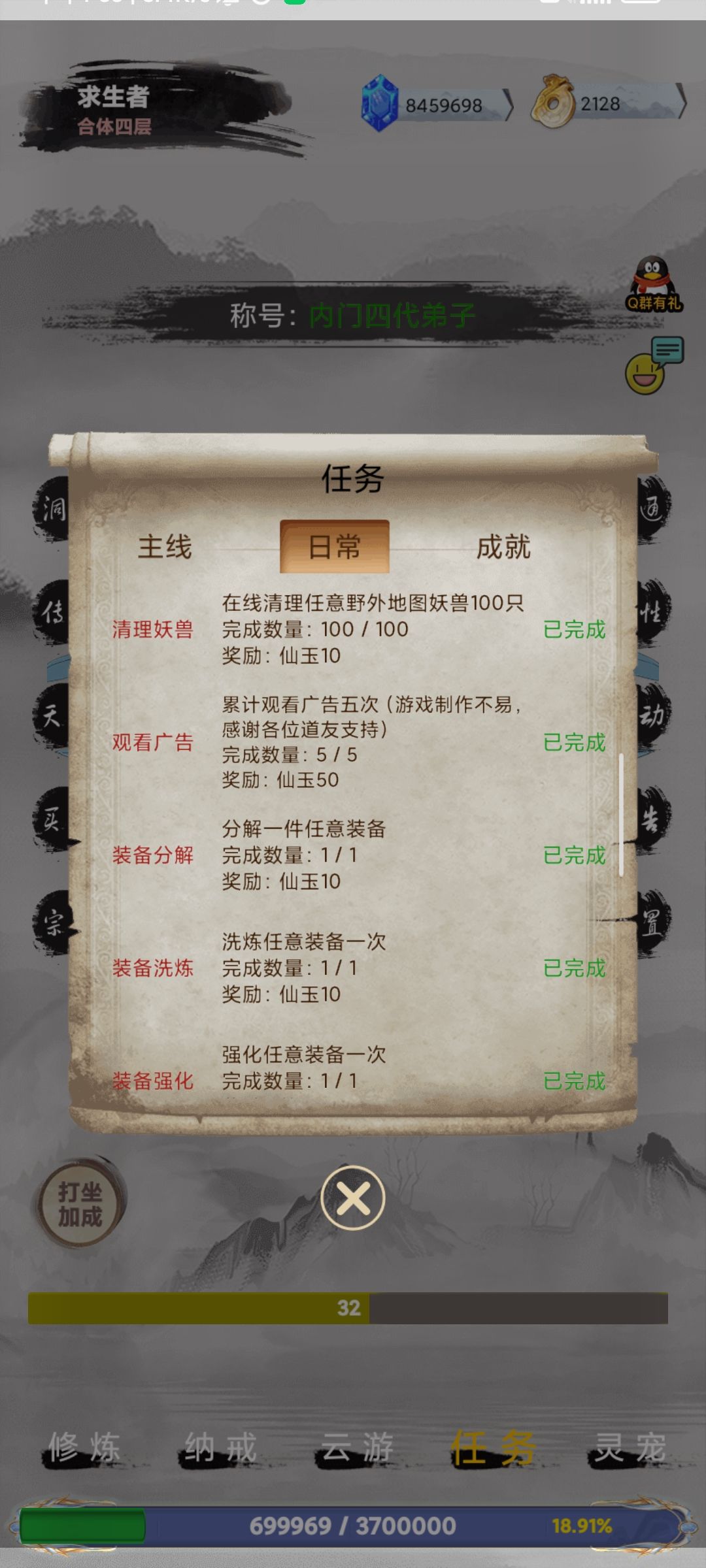①宗门内的每日任务,只需按照任务的内容完成即可,总共有10个,可获得每日宗门贡献和百分比升级经验。