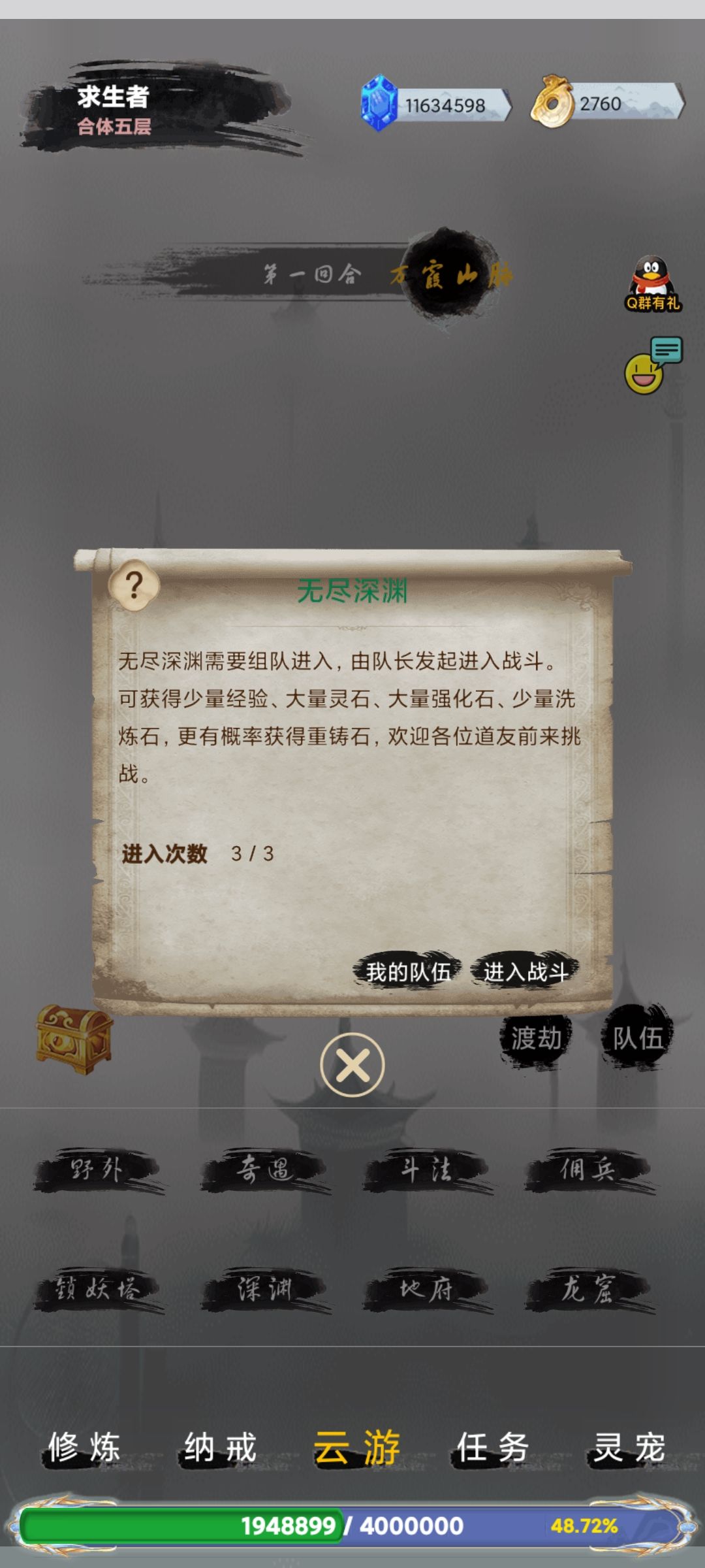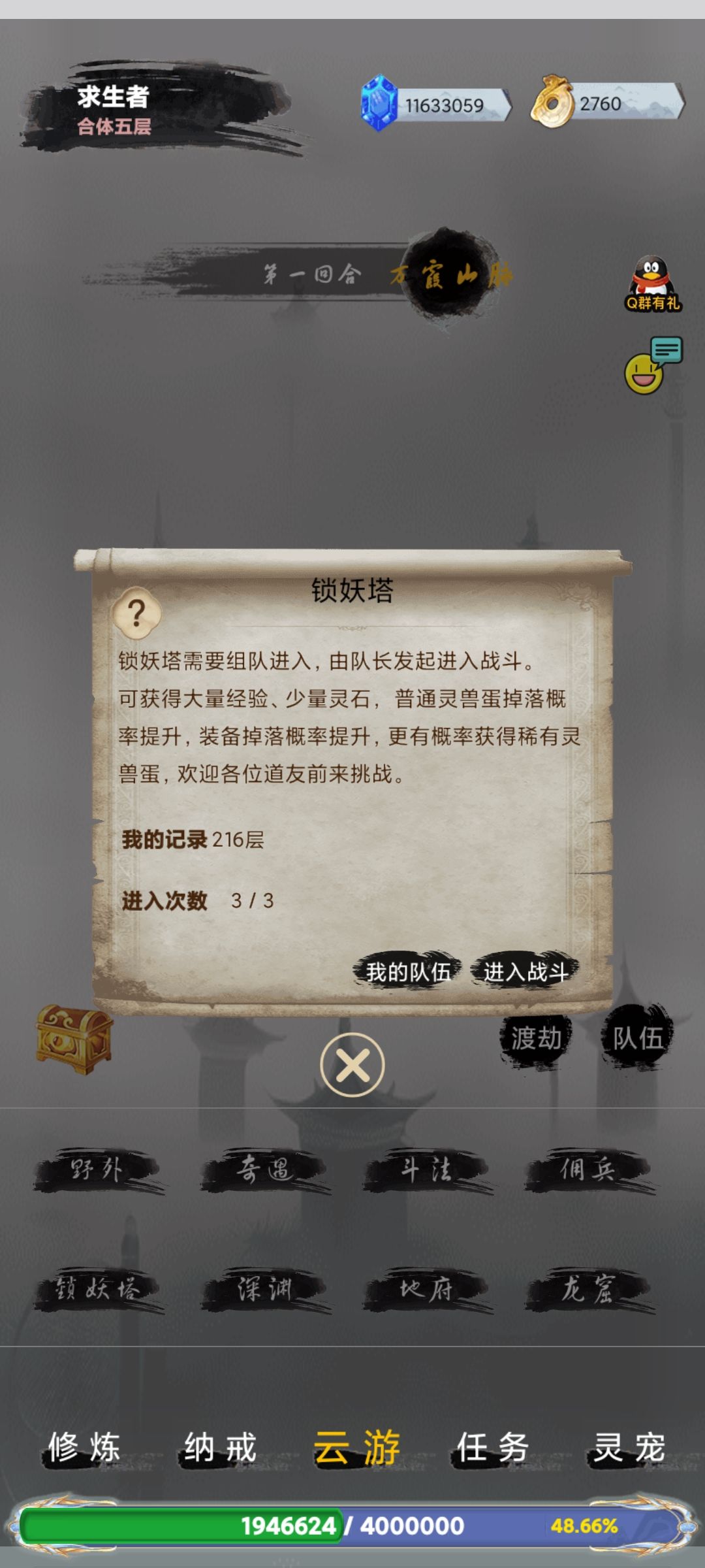 在qq群中@求生者一号,我会拉你打一天分神副本,稳稳上出巧境界