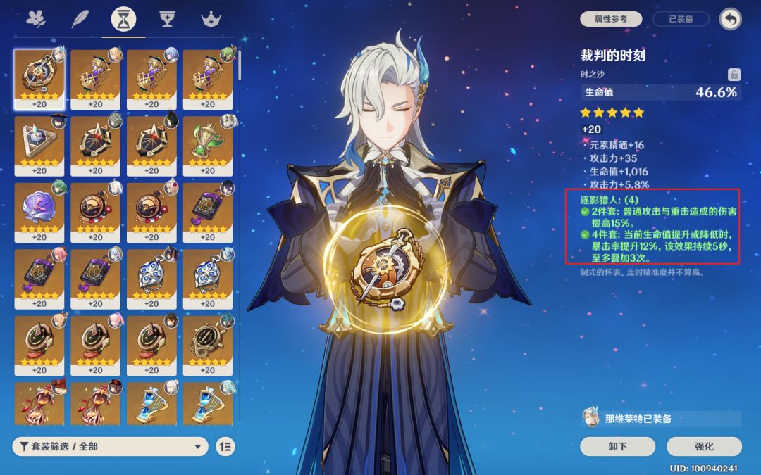 4件套:猎人4件套,没啥好考虑的了,唯一就是注意暴击率别堆溢出了,后期如果有重击加很多的2件套倒是可以和水伤2件套混搭。