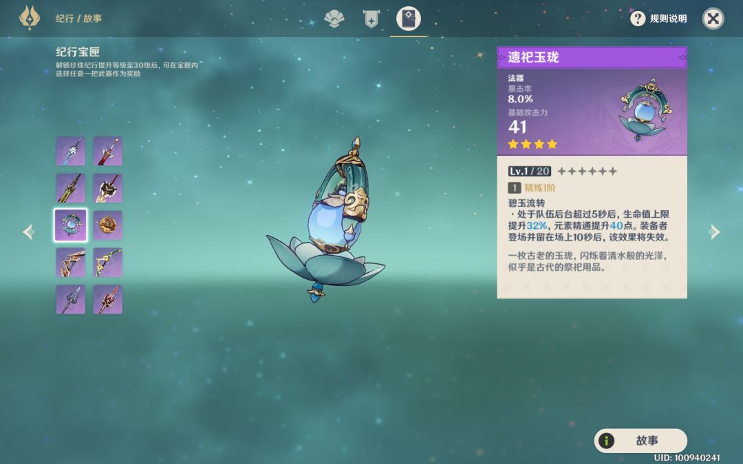 遗祀玉珑:枫丹版本新增的大月卡武器,属性上也是挺不错的,加暴击加生命加精通,缺点是想要满精要等大半年。大月卡武器在输出上限上比试作金珀高,但是充能压力就给到圣遗物了。