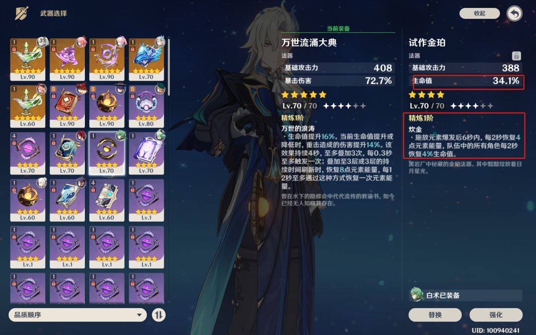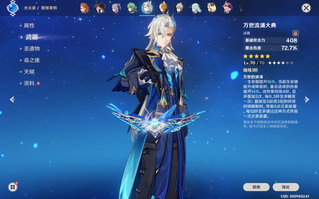 专武万世流涌大典:专武肯定最佳,这点不用考虑,有充足原石的就抽它,歪了护摩也不会亏,武器本身加爆伤加生命带充能,还能提升重击伤害,简直不要太好,也让那维莱特的圣遗物压力小了非常多。