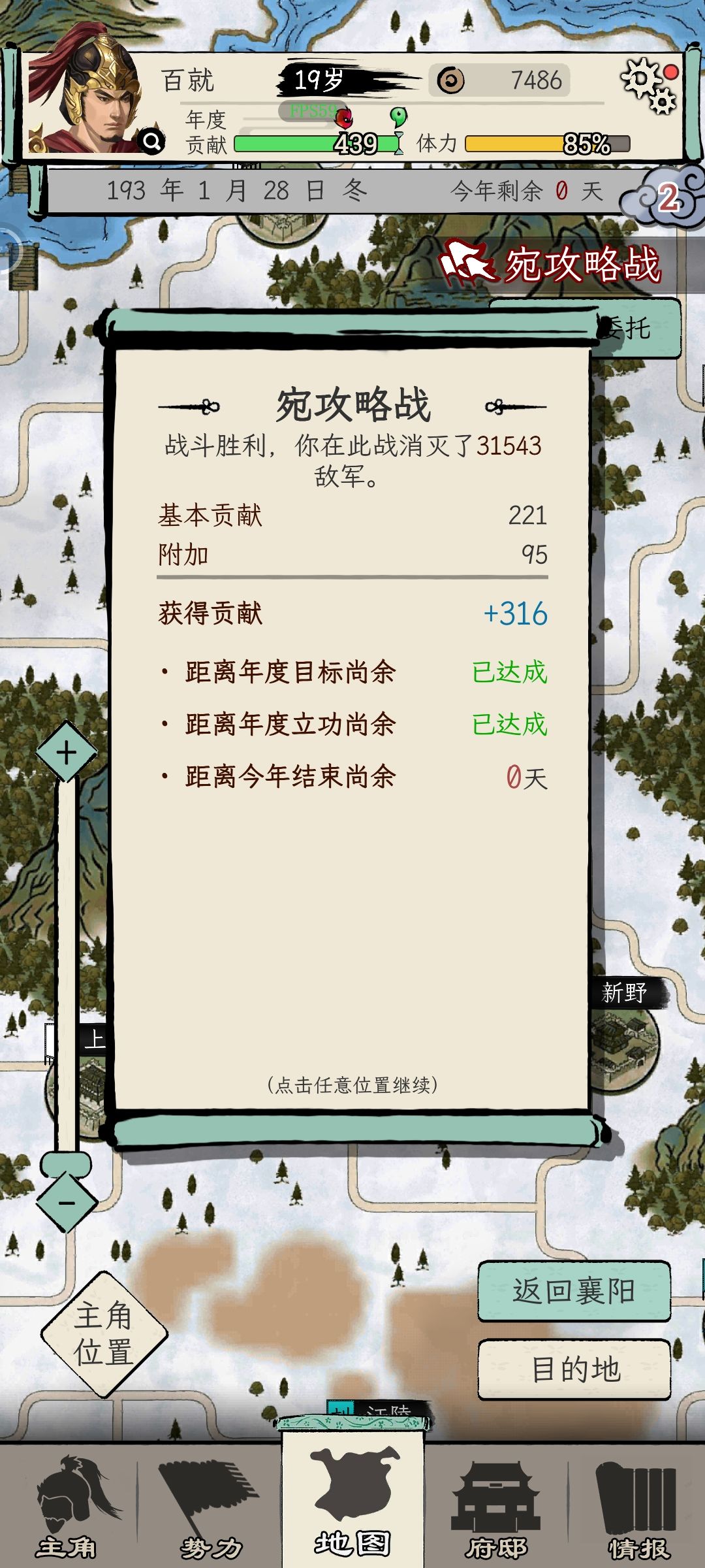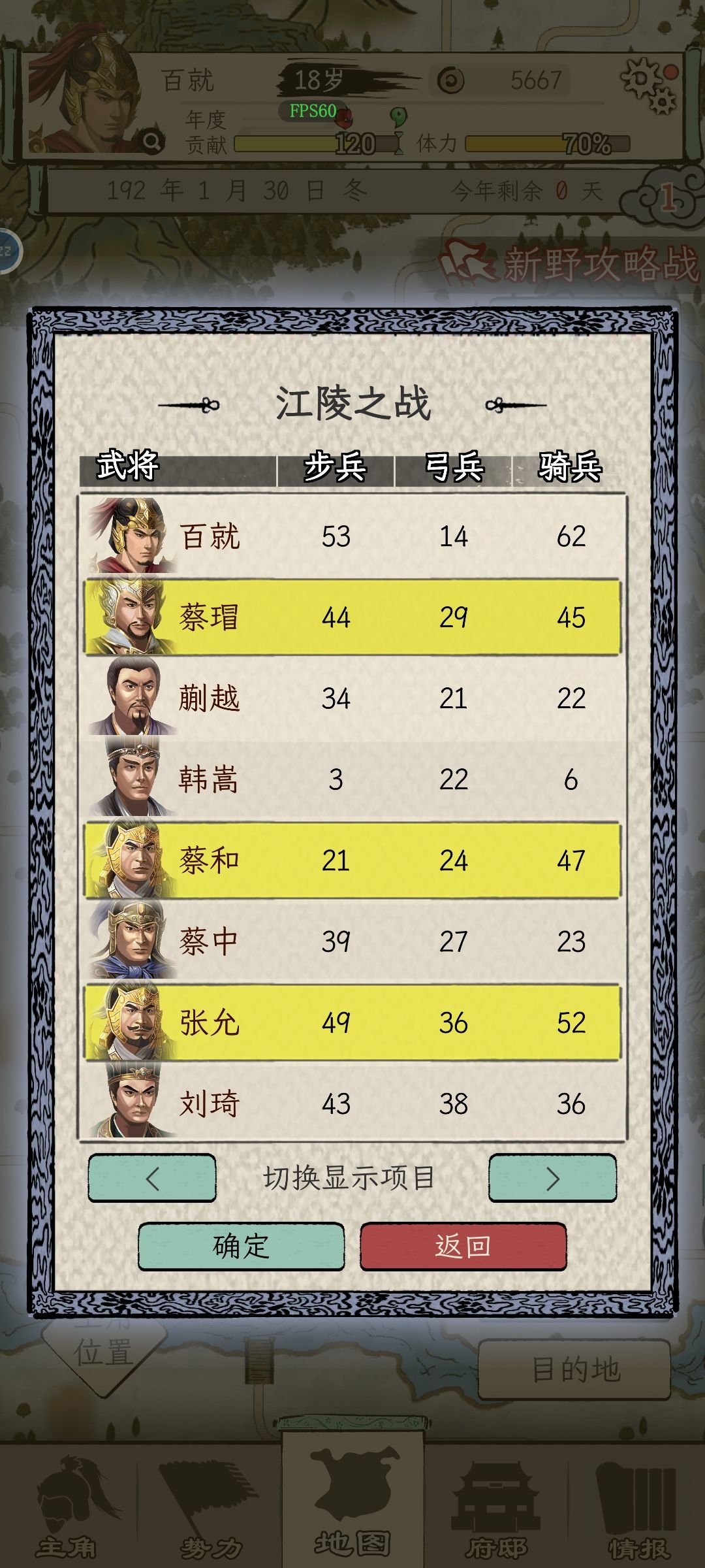 每年多线出征,快速征战。合理分配兵力是最麻烦的,也是最看运气的。运气好,一年可以灭掉好几个势力。