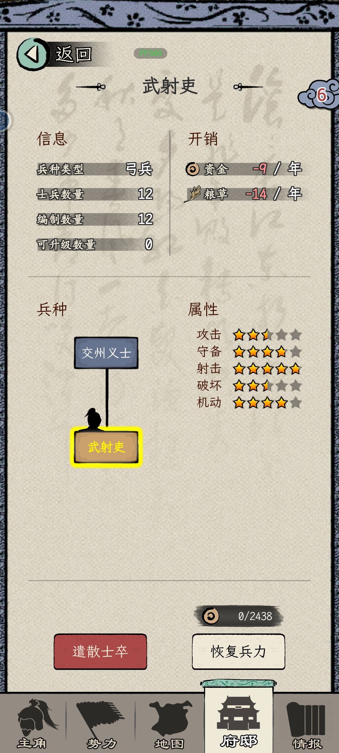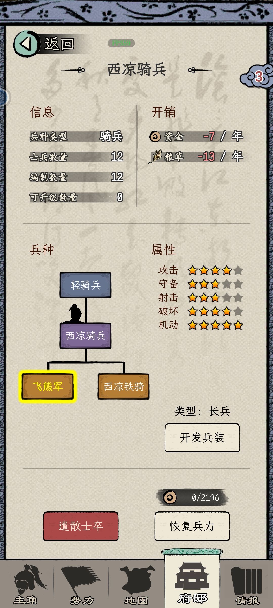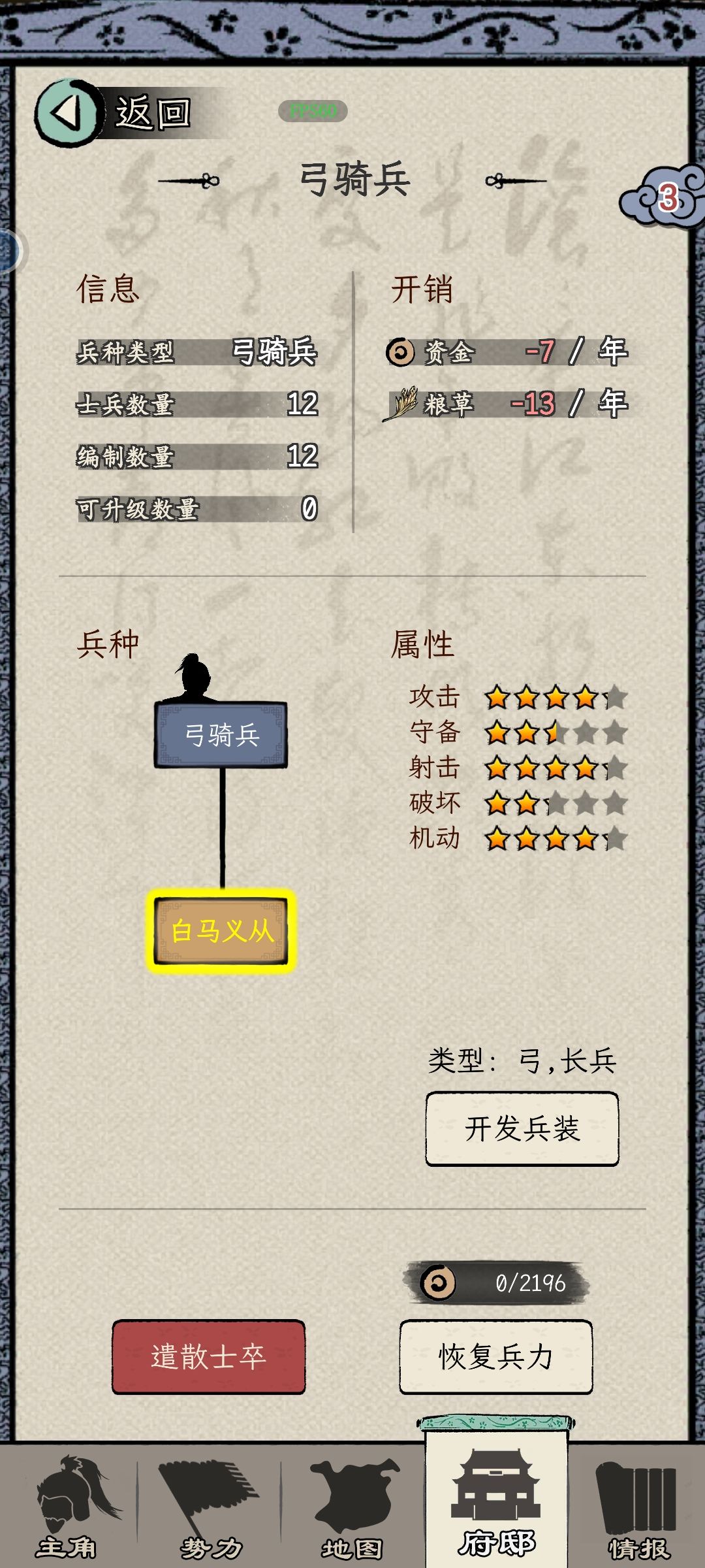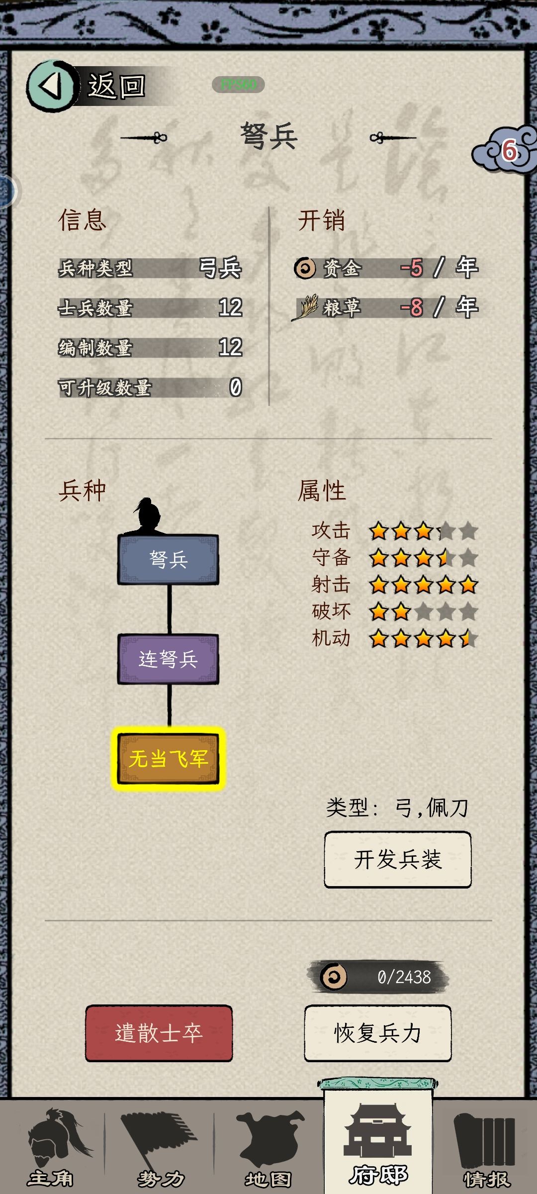 4、军队:兵力不满时,选择兵种。下回合会根据选择补充。