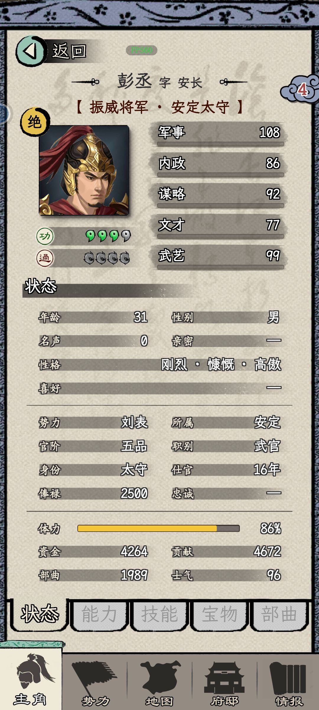 (1)体力:内政,巡城,赶路,比武,读书等会消耗体力。体力低于30点会生病,个人属性大幅下降,健康会临时降低,健康低于年龄就有概率死亡。