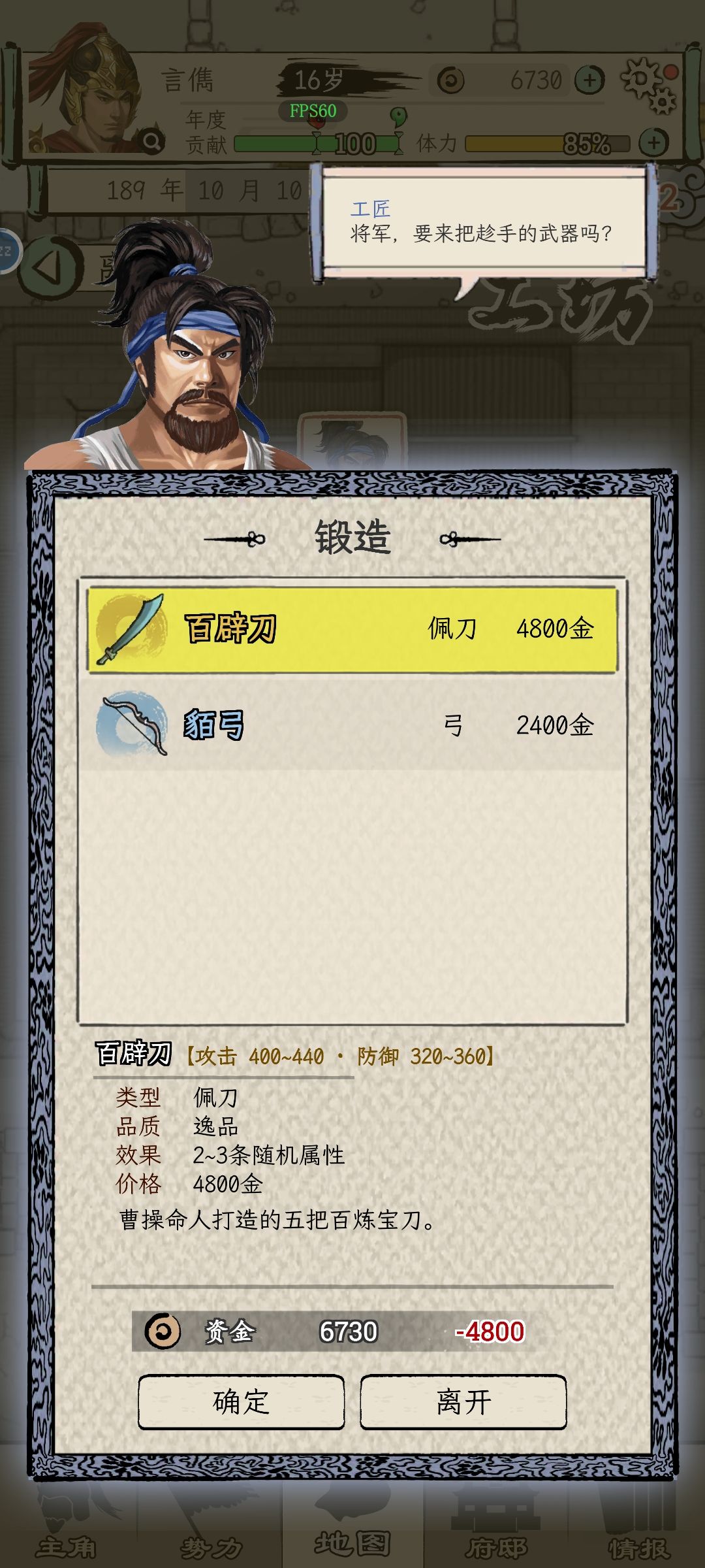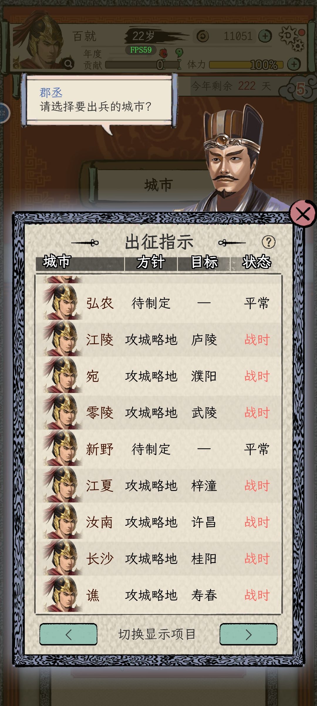 1、方针:选择攻城略地,每年年初将会打仗,杀100人得1贡献点,是初期当太守获取足够贡献点的最佳方式。