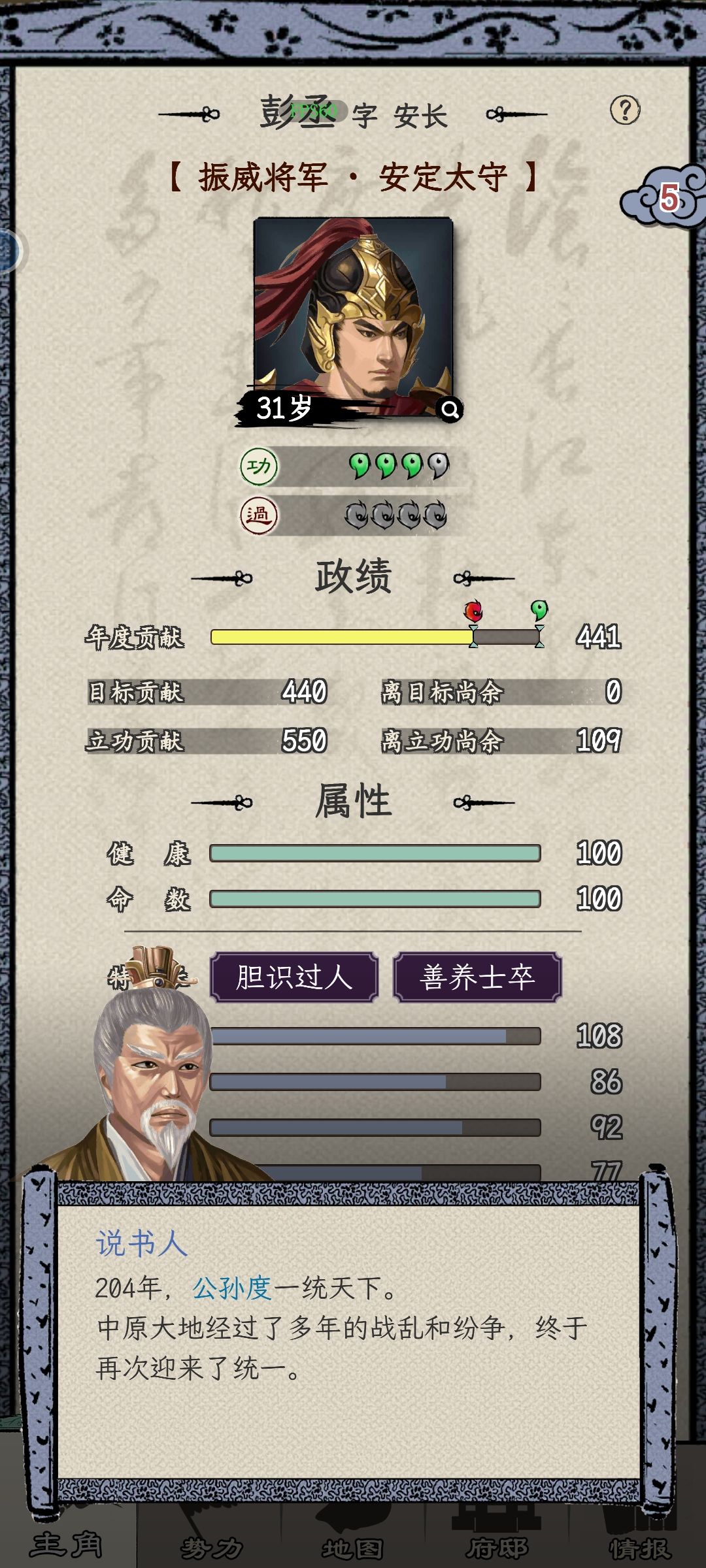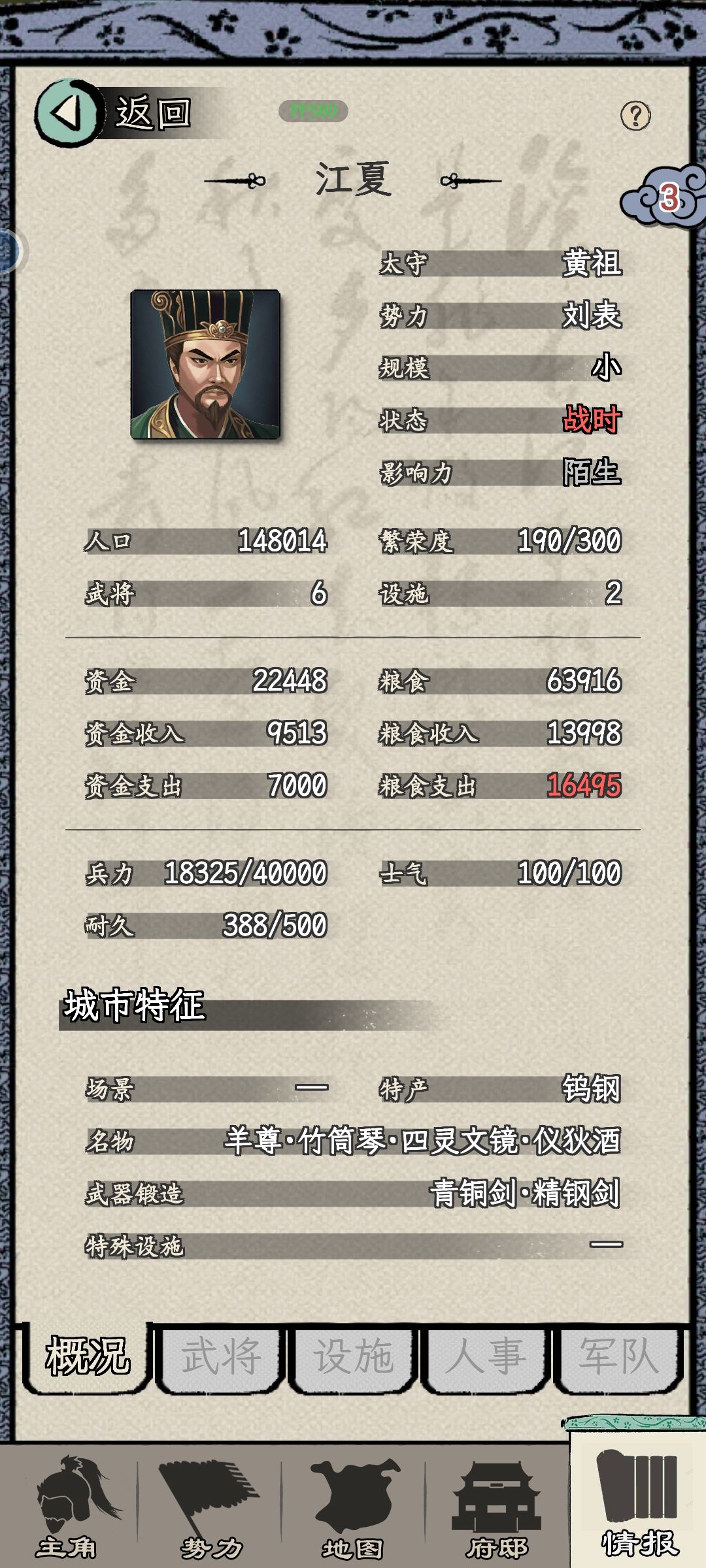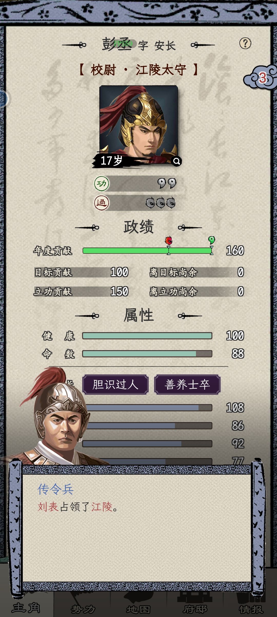 3、人才:每年自动获取1个奏章,攻下一座城池给1个。不管选什么特性的人才,主公都优先给你属性差的,但是一年最多3人,很快主公变光杆司令。