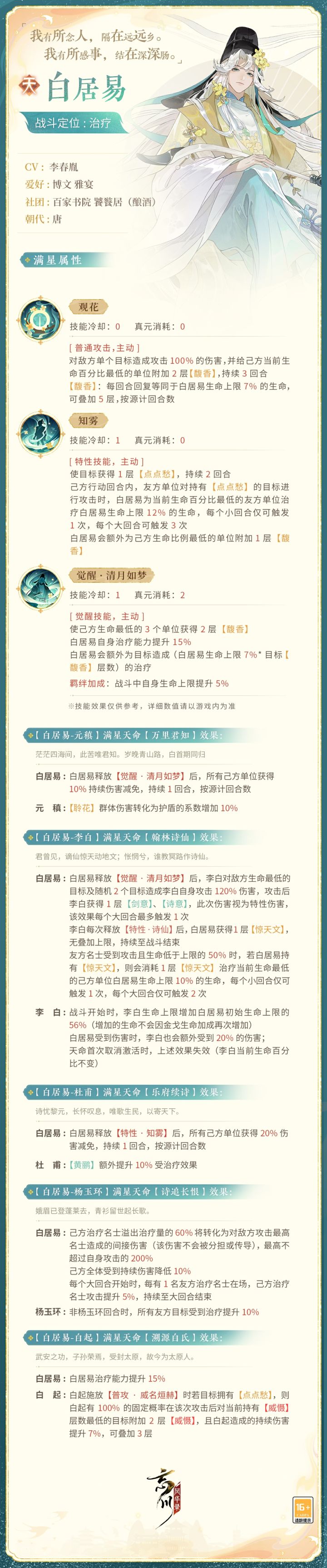 来到忘川后的白居易将作为治疗名士出战,使君大人快戳下图了解详情吧!技能以上线实装为准~