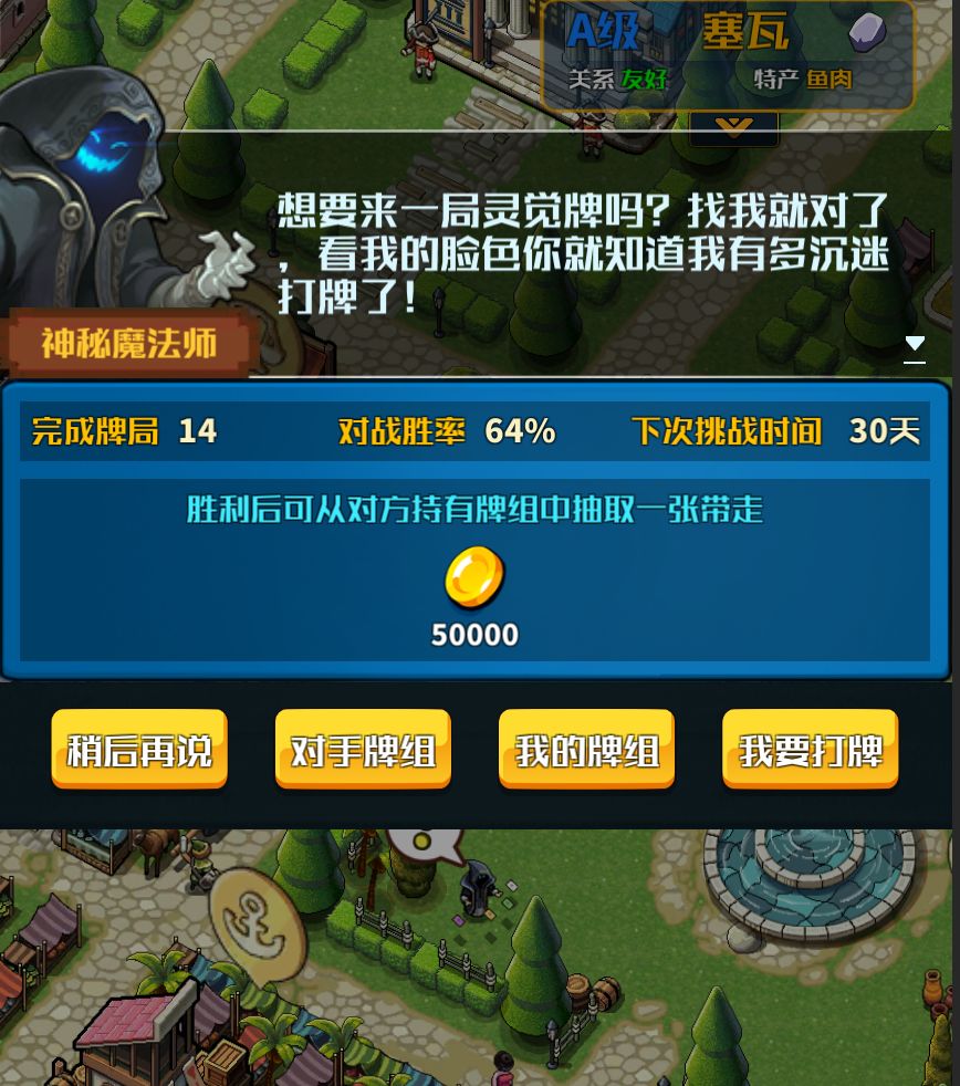 在总督府 2 级之后,可以与主港酒馆中的 打牌 NPC 对话,获得初始牌包,开启打牌之旅。