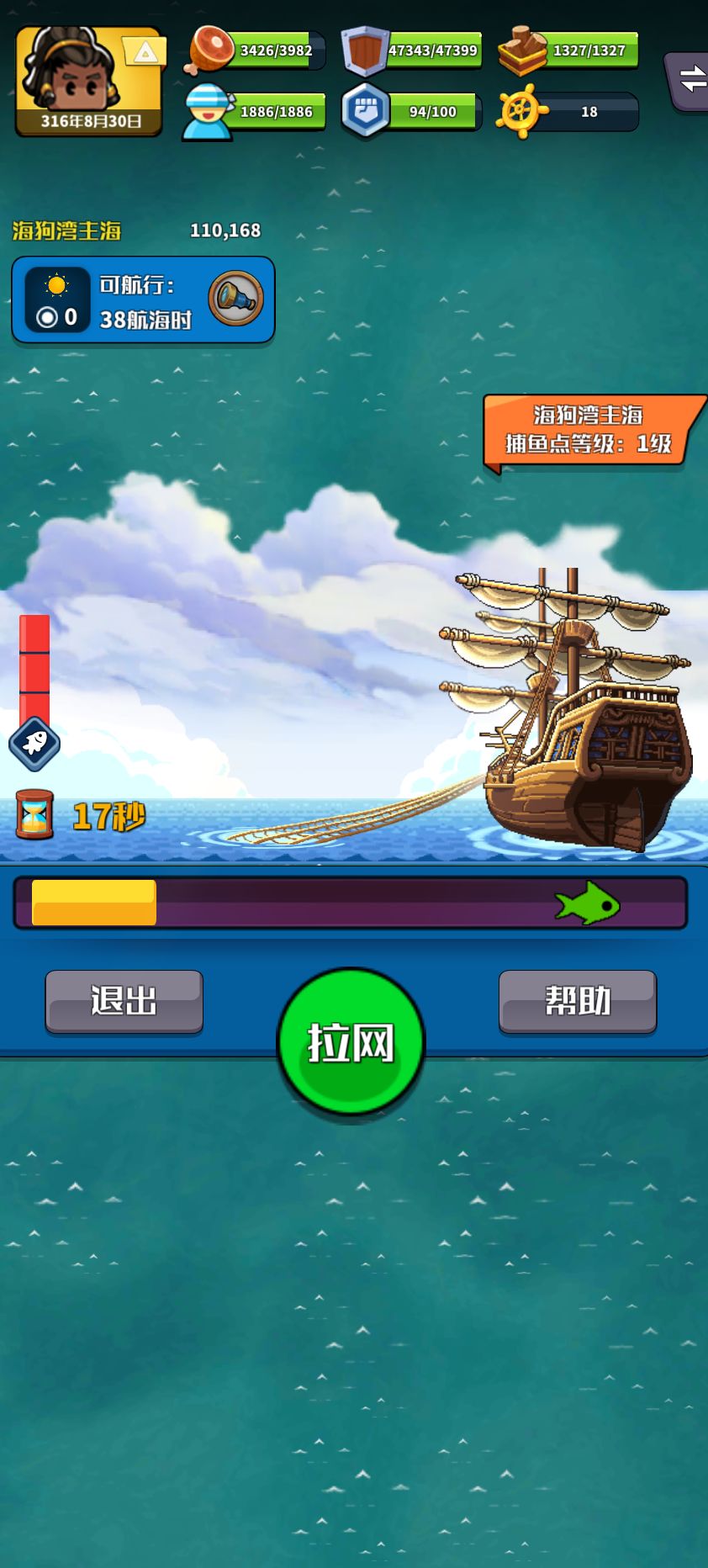 停靠捕鱼点后,需要消耗部分水粮进行捕鱼尝试,当捕鱼进行时,游戏时间正常计算。