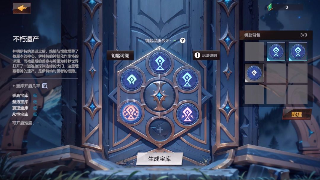 冒险者在战斗中,有概率触发来自古神的善意考验。完成不同类型的考验,收集对应的钥匙。集齐六枚可开启宝库之门,获取古神遗留的秘藏。