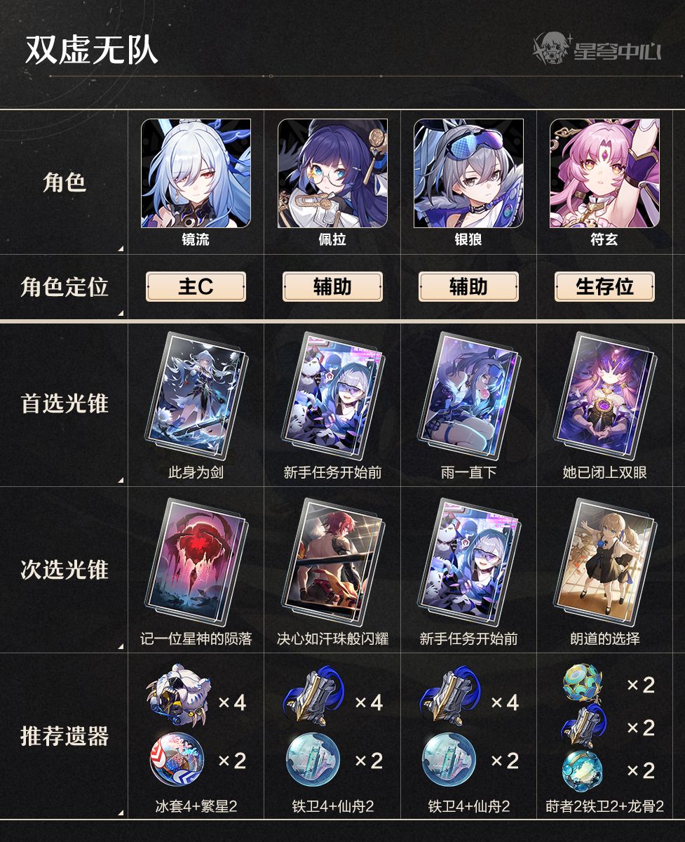 为了保证上弱点的稳定性,目前最优的生存位选择为符玄。但符玄的奶量很低,是完全没办法保住队友的,因此在双虚无配队中,推荐让银狼和佩拉都使用4铁卫套装,提高自身的生存能力。