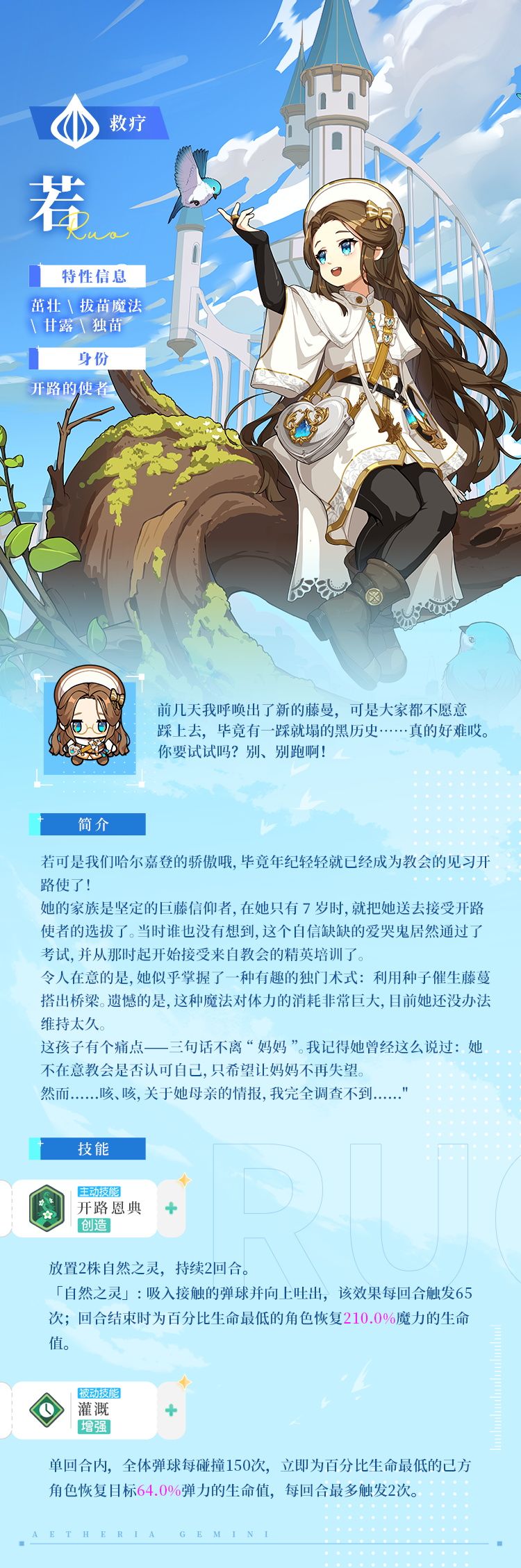 作为一名开路使者,若继承了种植藤蔓,开路搭桥的技术。用手杖轻点地面,正常情况下,藤蔓会徐徐长出,搭建出一座桥,让冒险者通过悬崖峭壁之类无法通行的地带——不过她暂时没法稳定发挥!
