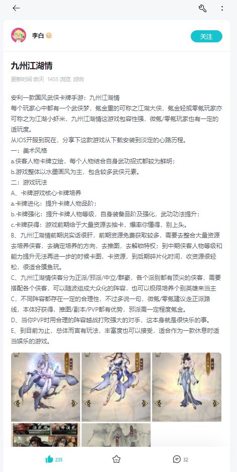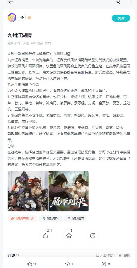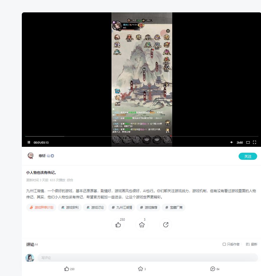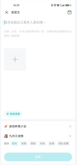在TapTap发布绑定九州江湖情的图文(文字不少于300字)、视频(不少于1分钟),向大家安利一款游戏,就是游戏种草。你可以分享对游戏的评测解读、游戏中的难忘时刻、游戏有趣日常和你为游戏进行的二次创作等。